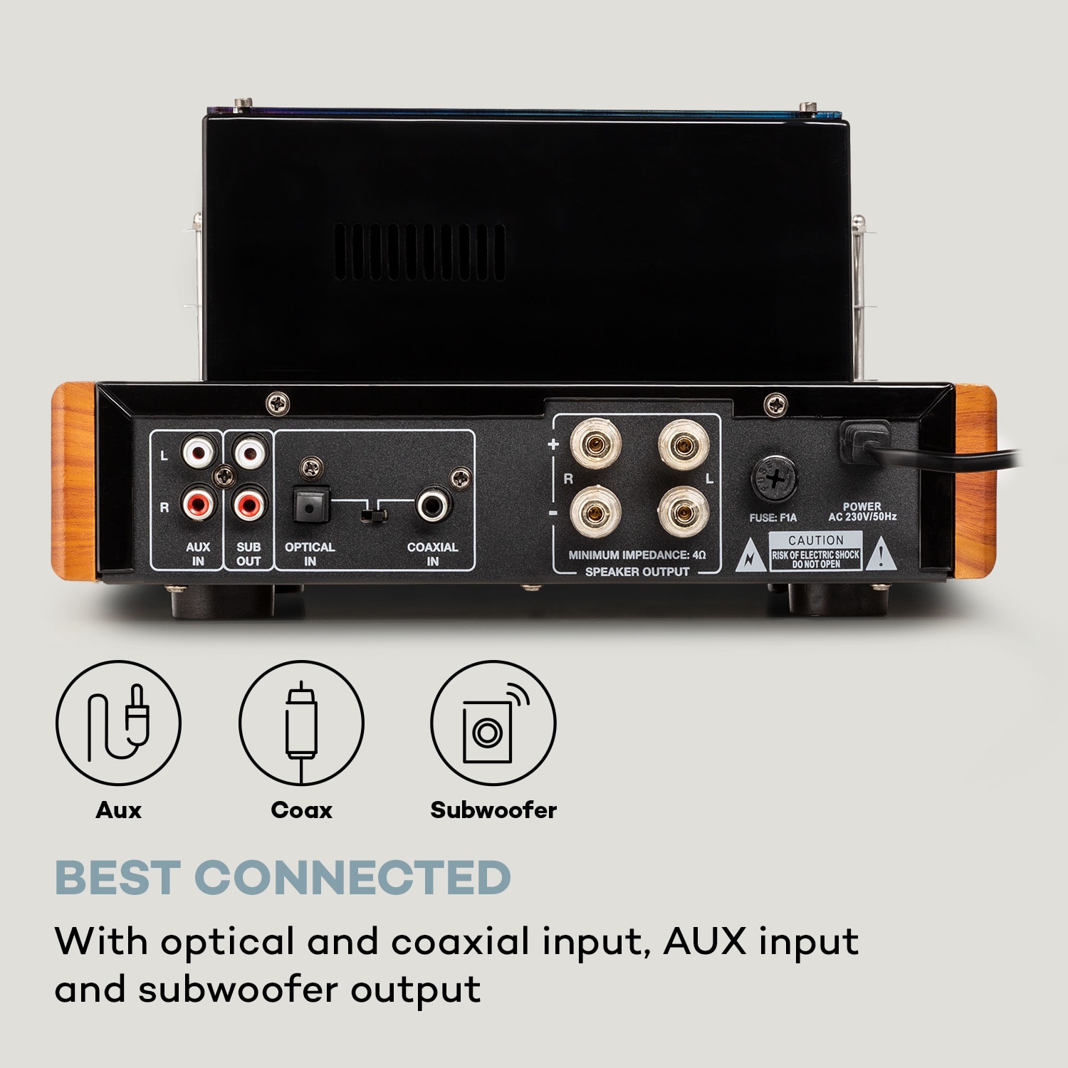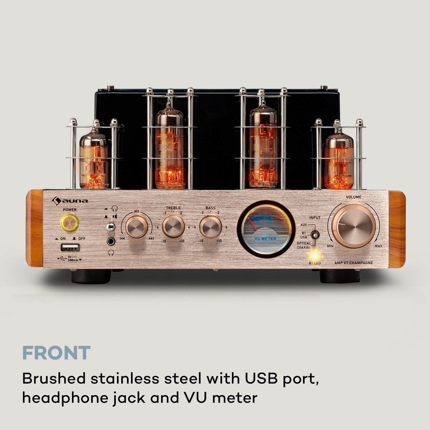 Elektrónkový zosilňovač Amp VT od auna je súčasťou slávneho oživenia elektrónkovej technológie, ktorá slávi zaslúžený návrat do domácich Hi-Fi systémov nielen vďaka svojej štýlovej estetike, ale predovšetkým vďaka kvalitnému zvuku. Zosilňovač Amp VT je vybavený všetkými modernými technologickými výhodami: prostredníctvom pripojenia Bluetooth možno všetky zvukové súbory pohodlne streamovať cez smartfón alebo tablet, zatiaľ čo sa zosilňovač prostredníctvom predného USB portu ponorí do MP3 dátových knižníc USB nosičov, ako sú USB kľúče a USB MP3 prehrávače. K dispozícii je aj zadný AUX vstup na pripojenie všetkých ostatných zdrojov zvuku, ako sú napríklad notebooky a tablety. Kvalitnému Hi-Fi zosilňovaču , ako je napríklad práve Amp VT od auna, by nemal samozrejme chýbať optický a koaxiálny vstup. Vizuálnym stredobodom zariadenia sú pôsobivé elektrónky, ktoré dodávajú zosilňovaču Amp VT neopakovateľný nostalgický šarm. Elektrónky vykresľujú na prevádzkovej úrovni hrejivý, empatický zvukový obraz, v ktorom sa obzvlášť dobre prejavujú jemnosti. Elektrónkový zosilňovač Amp VT od auna je navyše vylepšený o predný panel z brúsenej nehrdzavejúcej ocele.