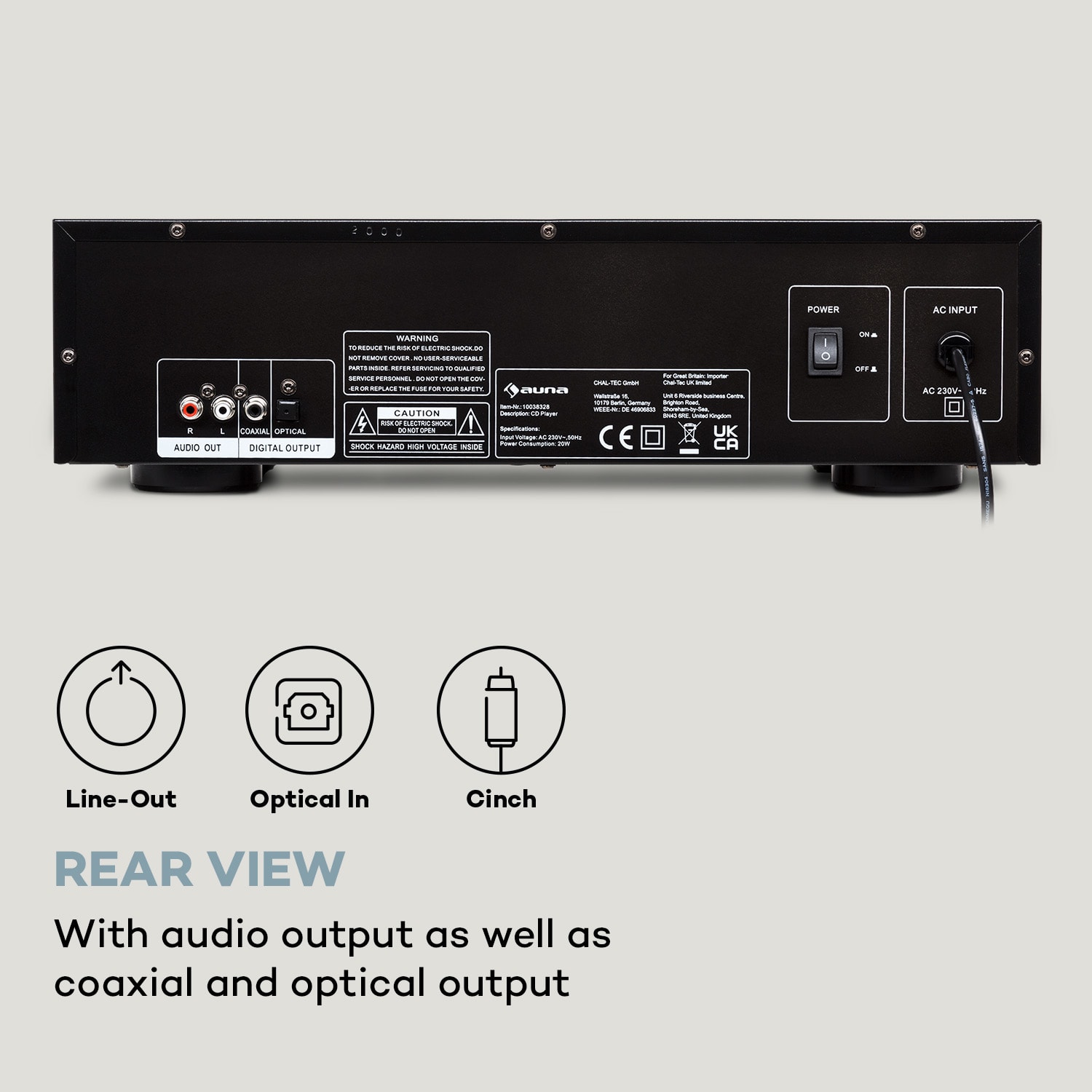 auna CD-1000 DG je klasický CD prehrávač s výsuvným slotom na CD a praktickým diaľkovým ovládaním. Okrem bežných zvukových diskov CD prehráva aj zvukové médiá vo formáte CD-R, RW a MP3. Jeho prehľadný ovládací panel zahŕňa aj LED displej. Okrem toho je na prednej strane CD-1000 DG ľahko prístupný USB slot. Na zadnej strane CD prehrávača nájdete audio výstup na jednoduché pripojenie zosilňovačov, ako aj koaxiálny a optický výstup. Jeho striedmy dizajn pôsobí vďaka hliníkovému prednému panelu stále luxusne. CD prehrávač CD-1000 DG od auna vkusne dopĺňa modernú atmosféru bývania milovníkov Hi-Fi.
