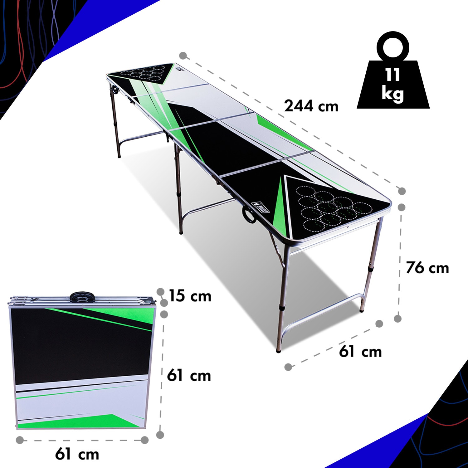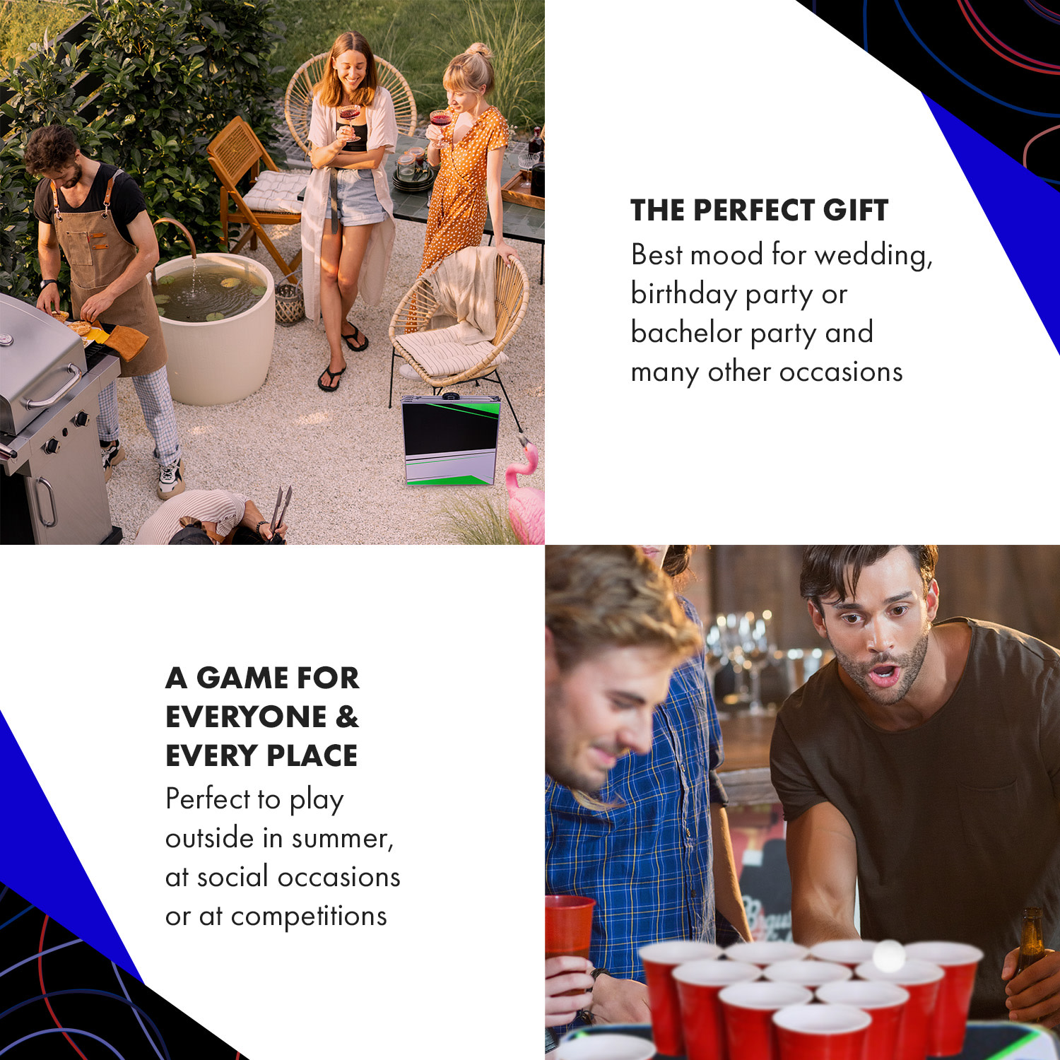 So stolíkom Backspin Beer Pong od BeerCup sa na žiadnej párty nebudete nudiť! Či už pravidelné výzvy s priateľmi, súťaže alebo len tak pre zábavu pri stretnutí – Beer Pong je jednoduchá hra na pitie a šikovnosť, ktorá sa pri každej príležitosti postará o zábavu. Princíp je jednoduchý: keď sa trafíte do súperovho pohára, musí Váš náprotivok piť! Rôzne napínavé variácie tohto základného hracieho princípu nájdete v priložených pravidlách.Zahrajte si na našich profesionálnych stoloch od BeerCup ako na „World Sries of Beer Pong“ v Las Vegas. Stolíky vyrobené z hliníka nie sú len v priebehu sekúnd rozložené a zložené, výškovo nastaviteľné, ale aj kvalitné a stabilné. Herné plochy sú zdokonalené silnou 6-farebnou potlačou a majú melamínový povrch odolný voči striekajúcej vode. Dodatočné extra je zabudovaný držiak na loptičky pod stolom, v ktorom môžete skladovať 6 pribalených Beer Pong loptičiek.