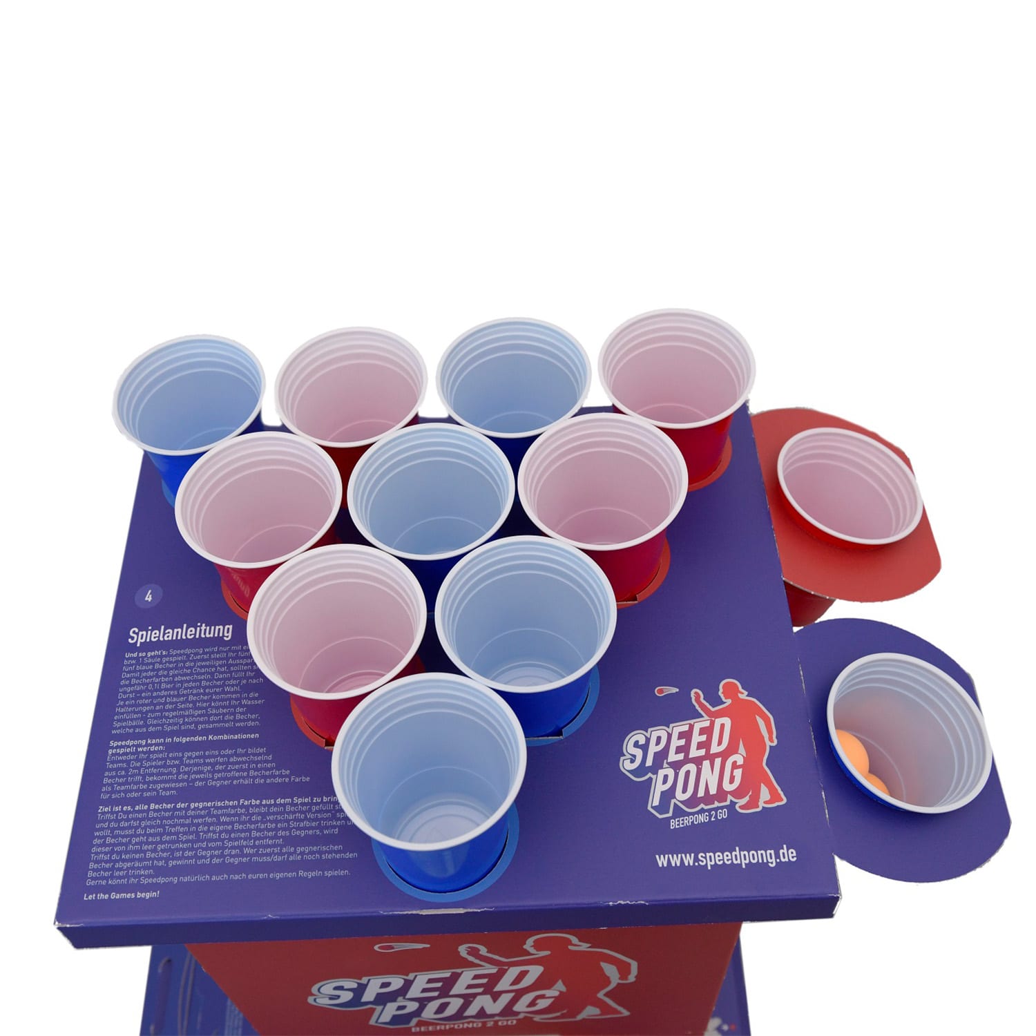 Beer pong pre najrýchlejších: už za 2 minúty zostavíš sofistikovaný hrací stĺp z kartónu a poháre umiestniš do určených otvorov. Stačí už len naliať pivo a zábava sa môže začať. Beer pong je obľúbená hra pitia a zábavy, ktorá je populárna predovšetkým v USA. Buď trendový a urob dojem na svojich priateľov. Pravidlá sú veľmi jednoduché a vytlačené na povrchu hracieho speedpongového stĺpa BeerCup Bounce, takže sa dajú kedykoľvek pri hre čítať.Každopádne, dva prvky, ktoré tvoria hru, sú: hádzanie a pitie! Speedpongová súprava preto obsahuje 3 loptičky a 12 pohárov. 6 pohárov na pivo v modrej farbe a 6 pohárov v červenej farbe. Klasické poháre presvedčia svojou robustnou kvalitou a maximálnym pohodlím pri pití vďaka zaobleným hranám.Kompletná speedpongová súprava od spoločnosti BeerCup je prenosný hrací stôl vyrobený z pevnej lepenky. Za 2 minút je zostavený, poháre umiestnené a hra sa môže začať. Zložený hrací stĺp funguje ako kufrík a dá sa vziať bez problémov kdekoľvek so sebou.