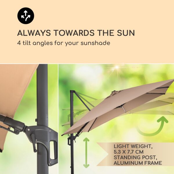 Všestranná ochrana pred slnkom! Flexibilný konzolový slnečník Arles od blumfeldt zaujme 360° rotáciou, veľkou slnečnou strieškou s UV ochranou 50+ a robustnou hliníkovou podpernou nohou.Vďaka bezpečnému podstavcu sa Arles môže flexibilne otáčať o 360° okolo vlastnej osi a poskytuje chladný tieň pri meniacom sa slnečnom svetle aj bez toho, aby musel byť úplne priemiestnený. Štvorcová slnečná strieška z vodoodpudivého polyesteru s ochranou proti UV žiareniu 50+ spoľahlivo odvádza ľahký dážď a UV žiarenie. Robustný a ľahký stojan z hliníka s ochranou proti korózii zaujme nielen svojou vysokou stabilitou, ale umožňuje aj jednoduchú prepravu celej konštrukcie. Vďaka inteligentnej konzolovej konštrukcii s plastovou kľukou a hliníkovou rukoväťou sa dá slnečná clona otvoriť alebo zatvoriť v okamihu a nastaviť na požadovaný uhol v 4 stupňoch. V zatvorenom stave sa dá priestorovo úsporne skladovať, kým ho nebudete opäť potrebovať. Dodávaná základňa stojana tiež zaisťuje bezpečné uchytenie za každých okolností.Slnečník Blumfeldt Arles je však aj v noci doplnkom záhrady a terasy, ktorý zlepšuje atmosféru. Integrované LED osvetlenie dodáva priestoru na sedenie jedinenčú atmosféru v siedmich voliteľných farbách.Vychutnajte si príjemné ochladenie počas horúcich letných dní v záhrade, na balkóne alebo na terase: blumfeldt Arles slnečník obohatí každodenný život o chvíle pohodového relaxu.