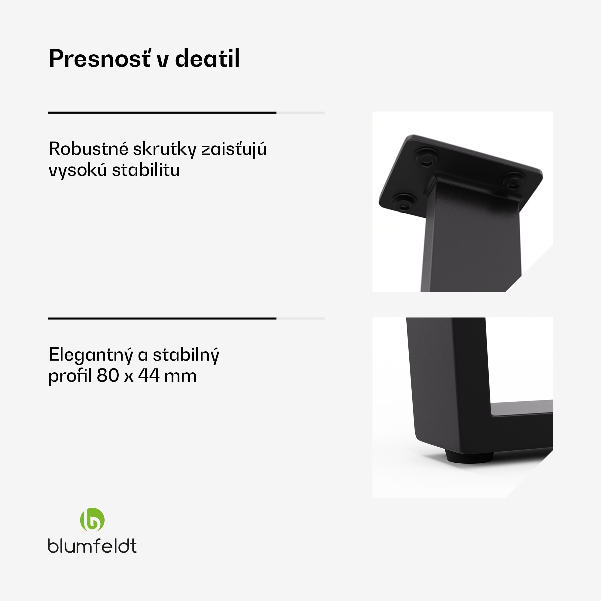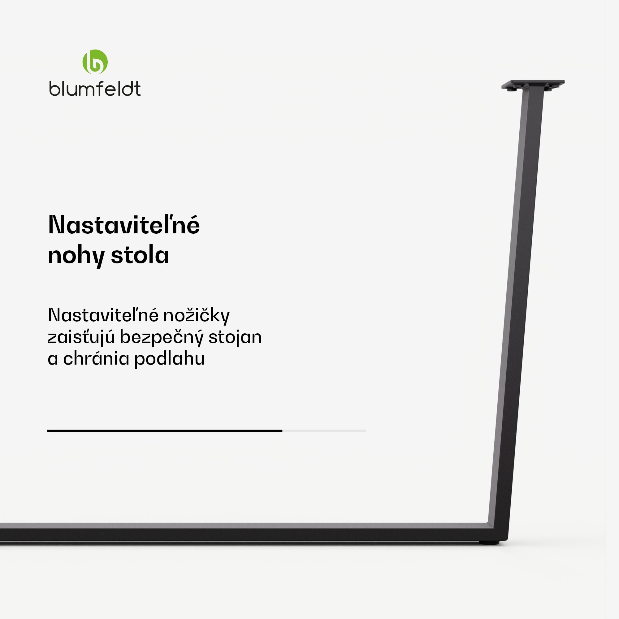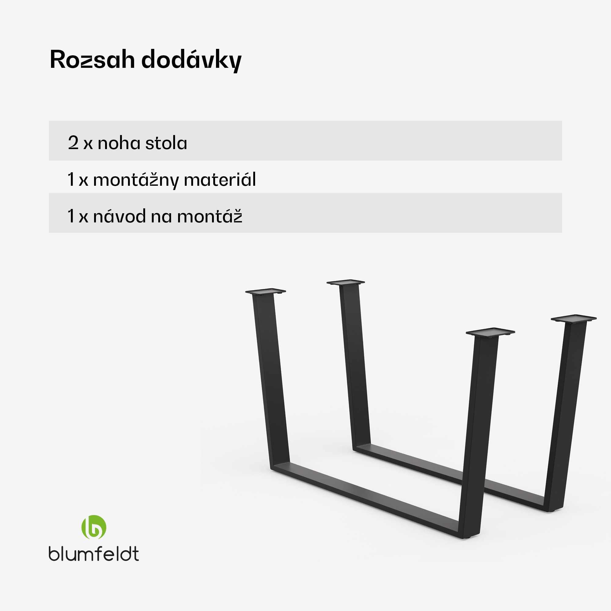 Stolové nohy Blumfeldt Ayr kombinujú súčasný dizajn s vysokou funkčnosťou a dodávajú každej jedálni príťažlivú estetiku. Štvorcové stolové nohy sa harmonicky začleňujú do industriálneho alebo minimalistického štýlu zariadenia a dodávajú štýlový akcent.Moderný dizajn, stabilita a kvalitné spracovanie s čiernou povrchovou úpravou stanovujú štandardy kvality. Kovové stolové nohy Blumfeldt Ayr zaručujú robustnosť a dlhotrvajúcu stabilitu. Nohy stola s výškou 43 cm a šírkou 62 cm sú ideálne pre stoly so šírkou nad 70 cm. S nohami stola Blumfeldt Ayr získate nielen funkčný prvok, ale aj štýlový dizajnovú čerešničku vo vašej jedálni.