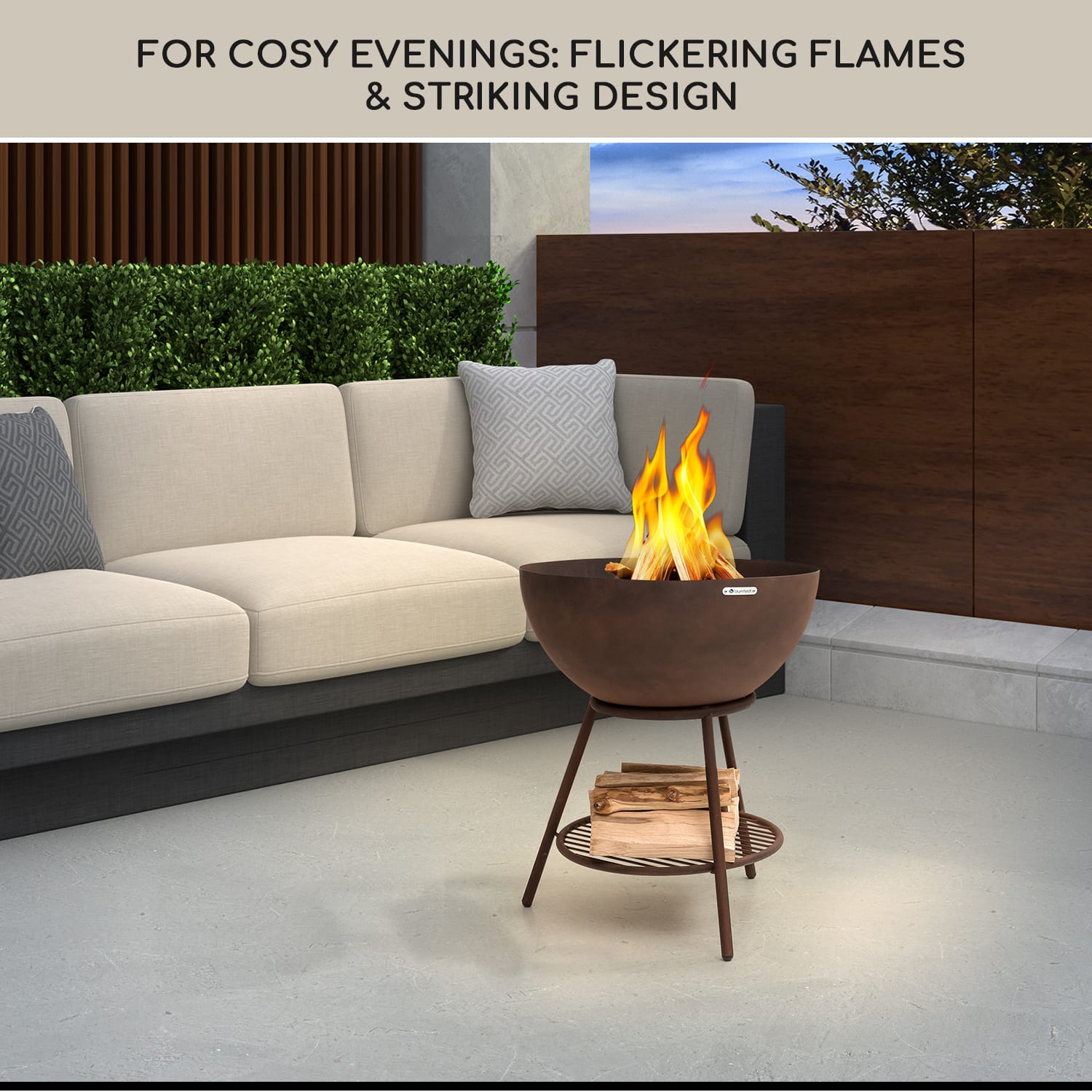 Ohnisko blumfeldt Azuma je gril a romantické ohnisko zároveň – dizajnovo výrazný pútač pozornosti pre vašu záhradu alebo terasu.Zažite všestrannú atmosféru táboráku s výhľadom na hrejivé plamene: Tu môžete grilovať pohodlne v horizontálnej polohe alebo môžete pologuľu nastaviť diagonálne pre hru ohňa chránenú pred vetrom. Ohnisko Azuma od blumfeldt je vďaka svojej 2 mm hrubej oceľovej stene veľmi robustné a bezpečne stojí na vyvýšenom stojane s tromi nožičkami. O pohodlie pri grilovaní, ohrievaní a vychutnávaní sa stará aj spodná polica, na ktorú môžete dekoratívne uložiť potrebné polená. Pre dlhodobú radosť a ochranu ohniska slúži aj kryt pred dažďom a vetrom. Vďaka priloženému pohrabáču a popolníku je jednoduché rozložiť oheň a vychutnávať si pohodové večery.