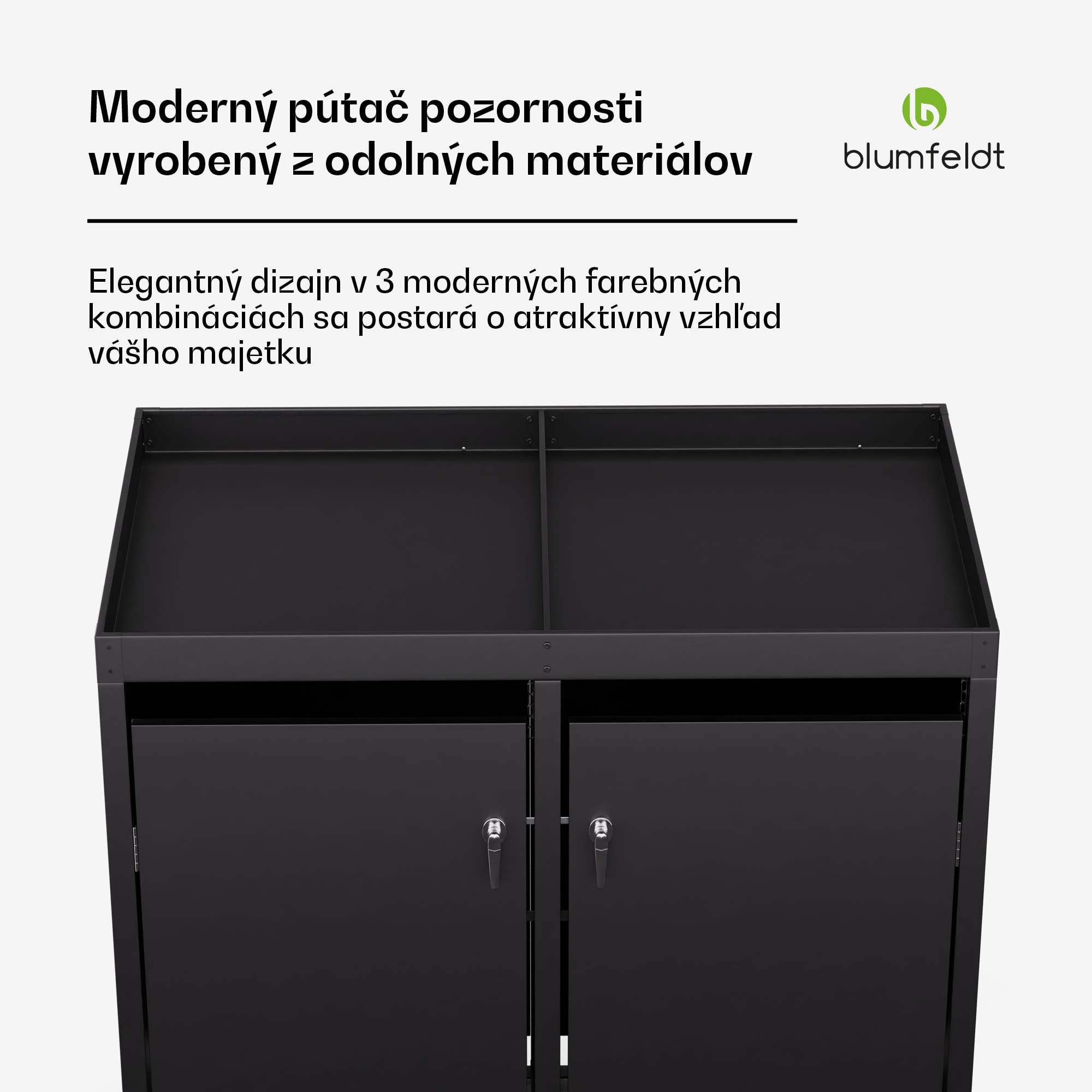 Box na odpadky Blumfeldt BinSafe je elegantným riešením na diskrétne ukrytie 2 odpadkových košov a zároveň vylepšenie vonkajšieho priestoru. S 2 uzamykateľnými dvierkami je ľahko prístupný spredu. Okrem toho box na odpadky s výsadbovou strechou ponúka možnosť ozvláštniť úložný priestor zeleňou. Integrované debničky na rastliny majú odtokové otvory na odvádzanie prebytočnej vody. Moderný dizajn dodá vášmu vonkajšiemu priestoru atraktívny a moderný vzhľad. Box je vyrobený z pozinkovanej ocele odolnej voči poveternostným vplyvom, a preto je mimoriadne trvácny a odolný voči poveternostným vplyvom. Či už ide o 60-litrové, 120-litrové alebo 240-litrové koše, box na odpadky BlumfeldtBinSafe ponúka priestor pre všetky štandardné veľkosti. Vďaka dodaným zámkom s kľúčmi sú vaše koše v bezpečí. Vďaka svojej vysokokvalitnej konštrukcii a praktickým funkciám je box na odpadky Blumfeldt BinSafe ideálnou voľbou na prehľadné uloženie vašich odpadkových košov a dodanie štýlu vášmu vonkajšiemu priestoru.