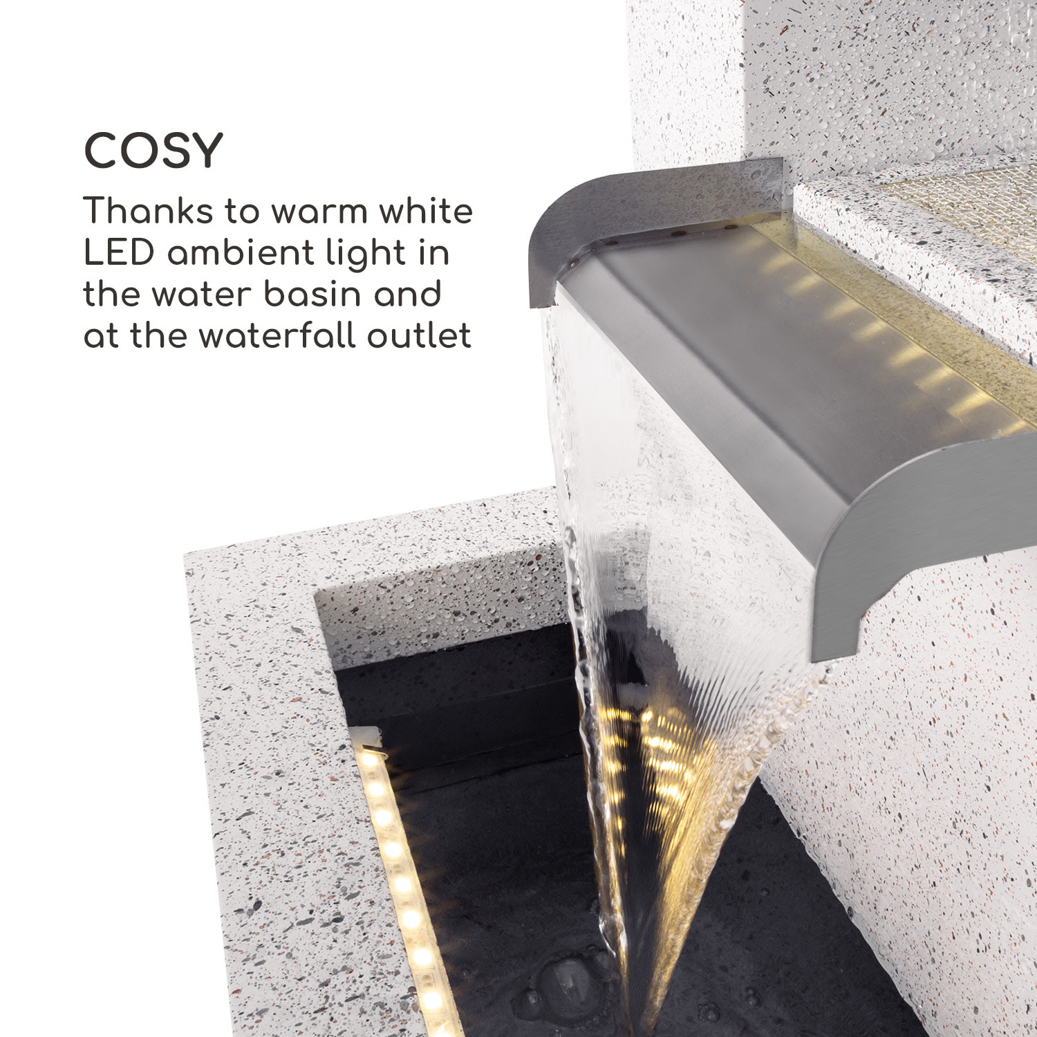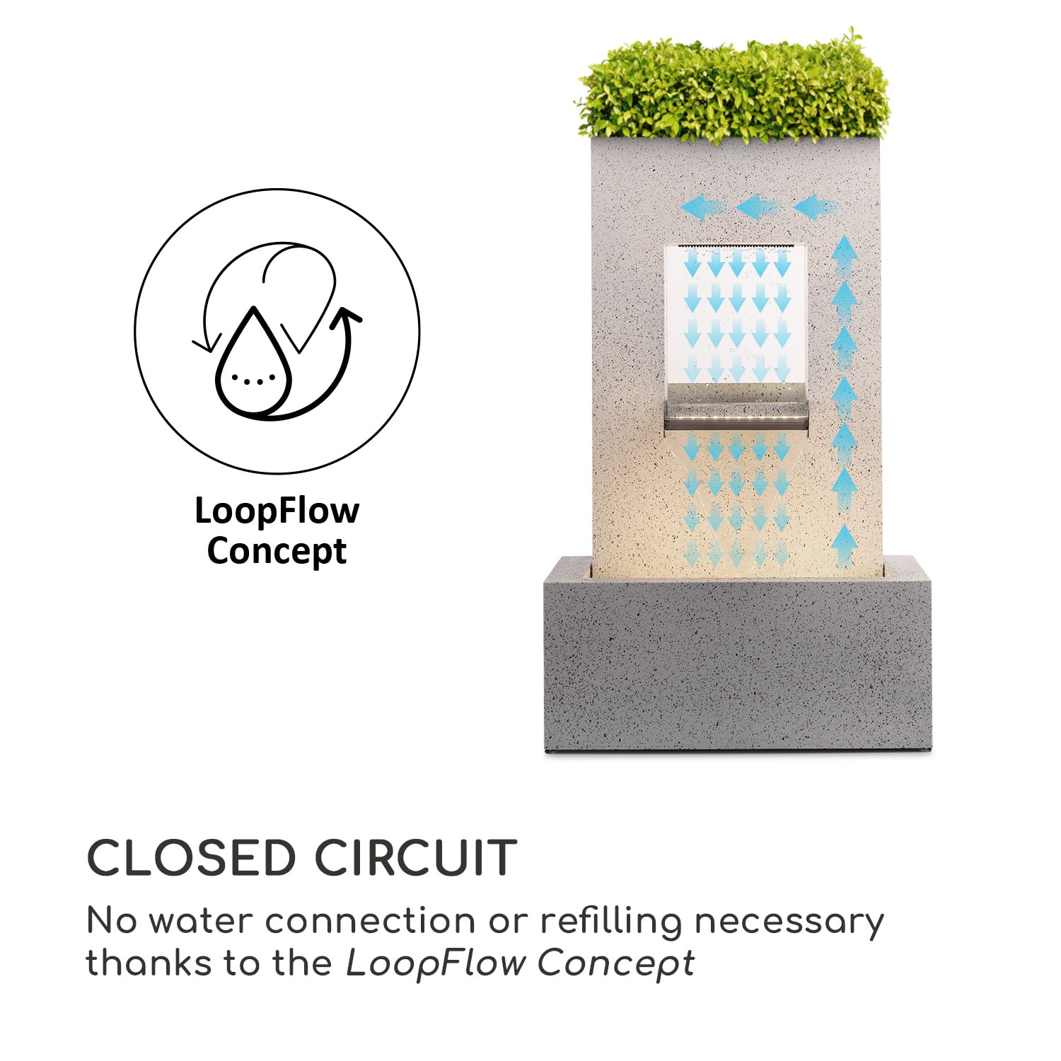 Zem a voda sa dokonale zjednocujú v dekoratívnej fontáne blumfeldt Bloomingstone. Okrasná fontána v modernom dizajne má na hornej strane integrovaný kvetináč. Odtok vody pod kvetináčom spôsobuje, že voda zhora kvapká ako dážď do zbernej nádoby. Z tohto poschodia tečie chladná voda ako vodopád späť do vodojemu. Dažďová fontána je poháňaná 20 W čerpadlom, ktoré umožňuje nepretržité stúpanie vody nahor. Vďaka konceptu LoopFlow Concept nie je potrebná vodovodná prípojka ani doplňovanie vody, mini čerpadlo udržuje naplnenú vodu v neustálom obehu. Teplé biele LED osvetlenie v nádrži fontány a pri odtoku vody z vodopádu pôsobí skutočne príjemne. Dekoratívna fontána Bloomingstone je vyrobená zo zinku a zaujme svojou terazzovou povrchovou úpravou. Vďaka káblu s dĺžkou 10 metrov je jej umiestnenie mimoriadne flexibilné a predstavuje skutočnú ozdobu balkóna, záhrady alebo obývacej izby.S fontánou Bloomingstone od spoločnosti blumfeldt získaš do svojho domova moderný a dekoratívny doplnok.