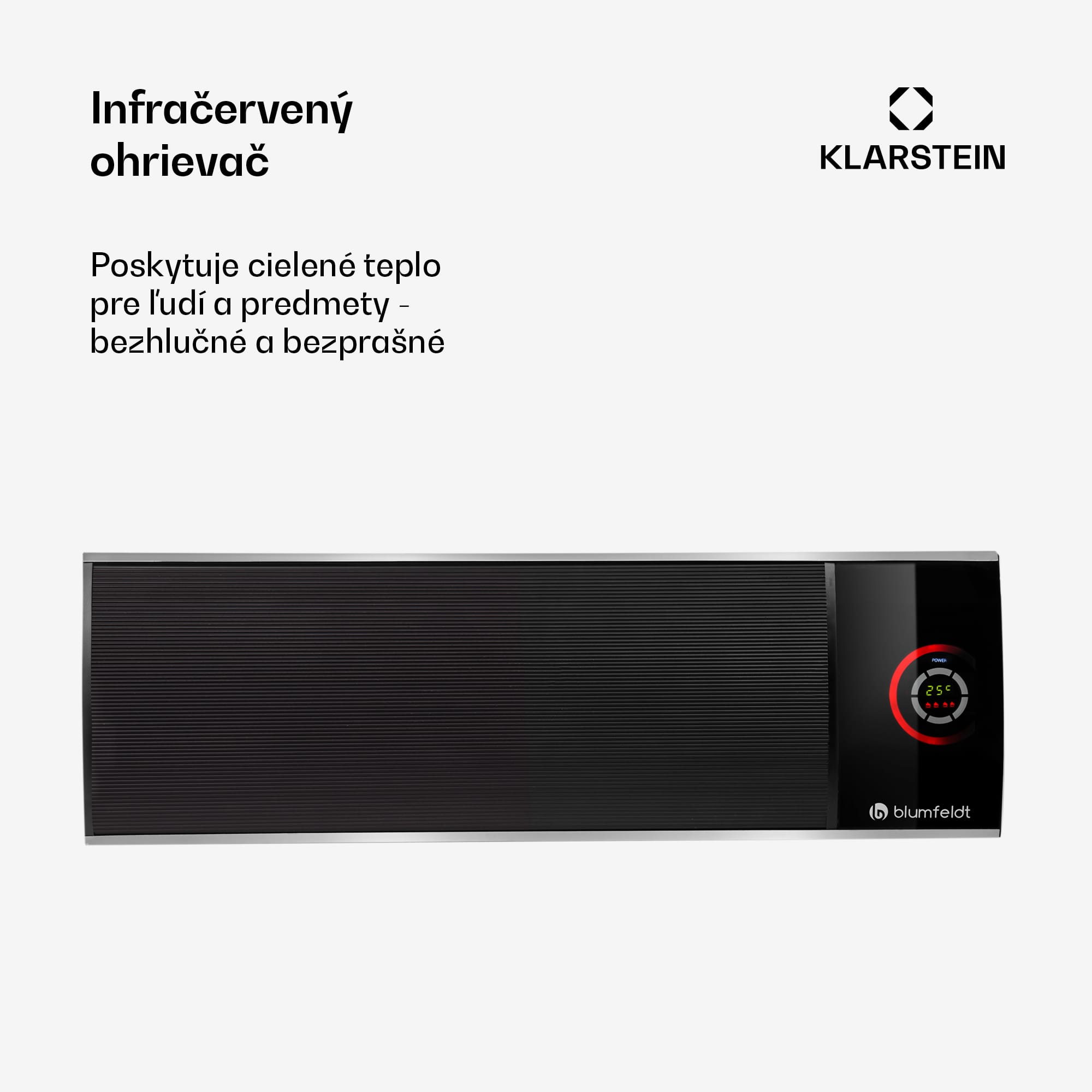 V tme sa lepšie klebetí, predovšetkým keď je poriadne teplo. S infračerveným tepelným ohrievačom Blumfeldt Cosmic Beam Ultra budú posedenia na terase, v párty miestnostiach alebo v záhrade príjemne teplé – úplne bez rušivého svetla. Tepelný žiarič Blumfeldt Cosmic Beam Ultra jednoducho namontujete na stenu alebo strop, vďaka čomu Vám nezavadzia, zatiaľ čo pod hliníkovým panelom rýchlo a účinne s výkonom 2200 W odovzdáva infračervené svetlo s dlhou vlnovou dĺžkou a ponára okolie do príjemného tepla. Vďaka infračervenej technológii je teplo odovzdávané cielene na objekty a osoby a vzduch nie je zbytočne ohrievaný. Dokonca studený vietor sotva ovplyvní výhrevný výkon. Vďaka tienenému vyžarovaniu neprodukuje ohrievač Cosmic Beam Ultra žiadne oslepujúce, červené svetlo, ktoré by prilákalo malé, okrídlené potvory ako napríklad komáre. Na veľkom dotykovom displeji alebo pomocou diaľkového ovládania ho nielen že môžete zapnúť a vypnúť ale aj na stupeň presne nastaviť želanú teplotu v rozmedzí od 5 do 45 °C ako aj nastaviť praktický časovač vypnutia až po dobu 9 hodín. Tepelný ohrievač Blumfeldt Cosmic Beam Ultra Vám umožní bezstarostné večere a plánovanie záhradných párty a osláv bez toho, aby ste si robili starosti s počasím. Vďaka extra veľkému výhrevnému telesu s rozmermi 100 x 32 cm poriadne ohreje aj väčšie plochy. Stabilná konštrukcia z hliníkového odliatku je odolná voči poveternostným vplyvom a vďaka IPX4 je nanajvýš „vyzbrojená“ na použitie v exteriéri. Dodávaný montážny materiál umožňuje jednoduchú montáž na stenu alebo strop. Oslavujte neskoro do noci alebo si užívajte romantický večer pri víne a svetle sviečok na terase, zatiaľ čo sa na nebi jagajú hviezdy. Vďaka terasovému ohrievaču Blumfeldt Cosmic Beam Ultra Vám bude príjemne teplo až do konca. Prosím, majte na vedomí, že ohrievač nepracuje v prípade, že zvolená teplota je nižšia ako momentálna teplota vzduchu (žiadna chladiaca funkcia).