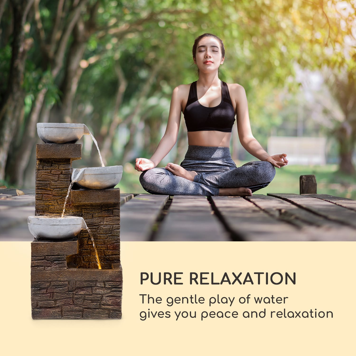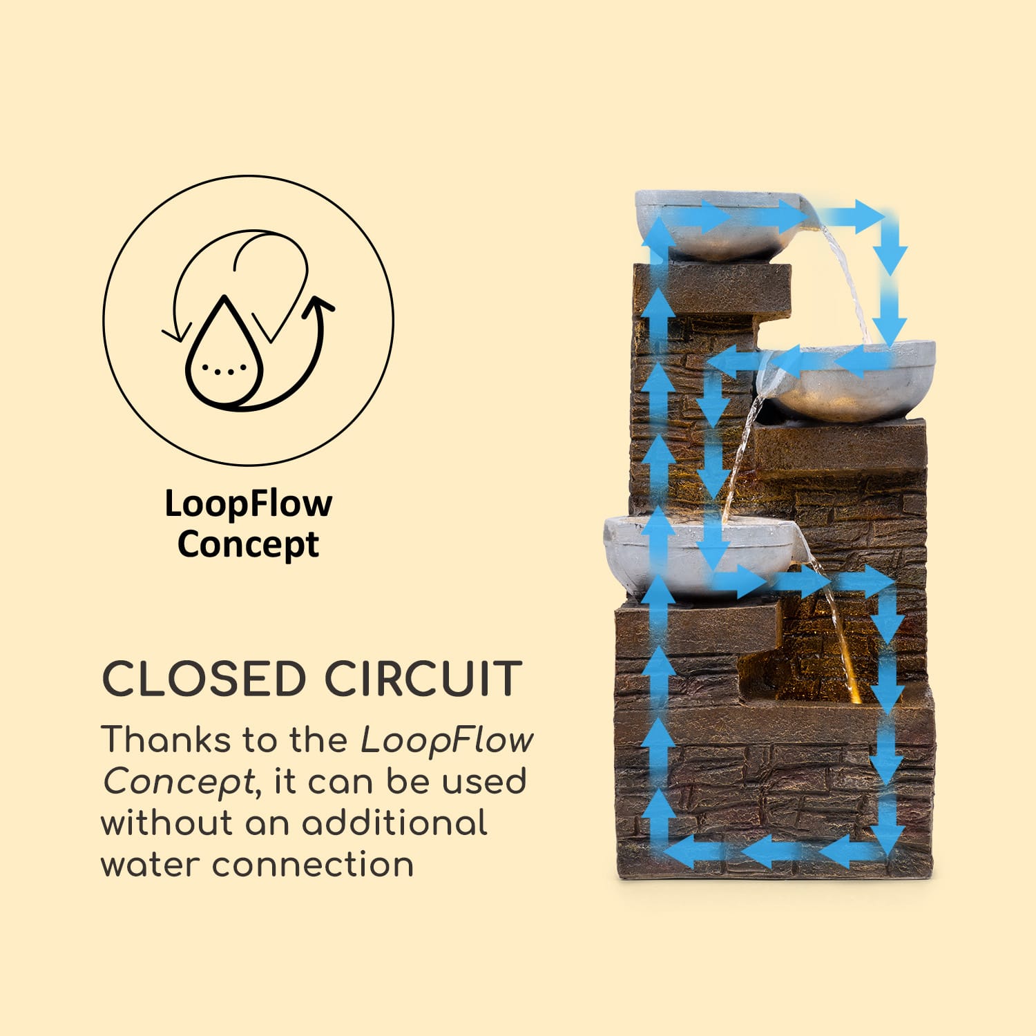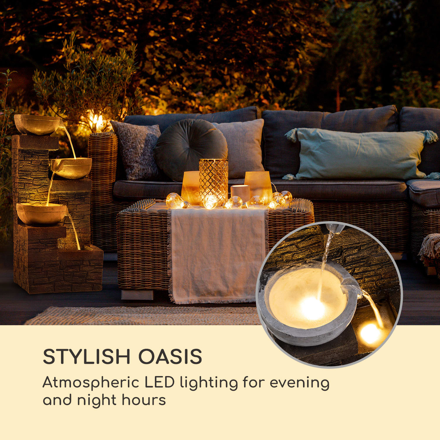 Kaskádová solárna fontána blumfeldt Fez je mimoriadne dekoratívna a je ozdobou každej záhrady, balkóna alebo obývacej izby. Slnečná energia umožňuje prúdenie vody medzi jej tromi poschodiami a svojou hrou vody pomáha spomaliť svet.Technológia kaskádovej fontány blumfeldt Fez Sunriver Technology sa so svojím solárnym panelom a integrovaným lítiovo-iónovým akumulátorom postará o to, aby fontána pracovala úplne nezávisle od sieťového napájania. Voda sa so jemným žblnkotom prelieva stálym tokom cez tri úrovne fontány. A vďaka pracovnému princípu v koncepcii LoopFlow Concept nie je potrebný žiaden prívod vody ani doplňovanie vody. Výkonné mini čerpadlo udržuje vodu, ktorá sa do fontány jednorazovo naleje, v konštantnej cirkulácii. Hneď ako príde večer, integrované LED osvetlenie začne dodávať vode v záhradnej fontáne blumfeldt Fez trblietavé akcenty a pôsobivo osvetľuje záhradu alebo terasu. Vďaka zhotoveniu z polyresinu je fontána nielen vizuálnym stredobodom pozornosti, ale je tiež mrazuvzdorná. Môže sa preto umiestniť a obdivovať vonku po celý rok.Oddych a odpočinok bez dodatočných nákladov na elektrinu: solárna fontána Fez od spoločnosti blumfeldt.