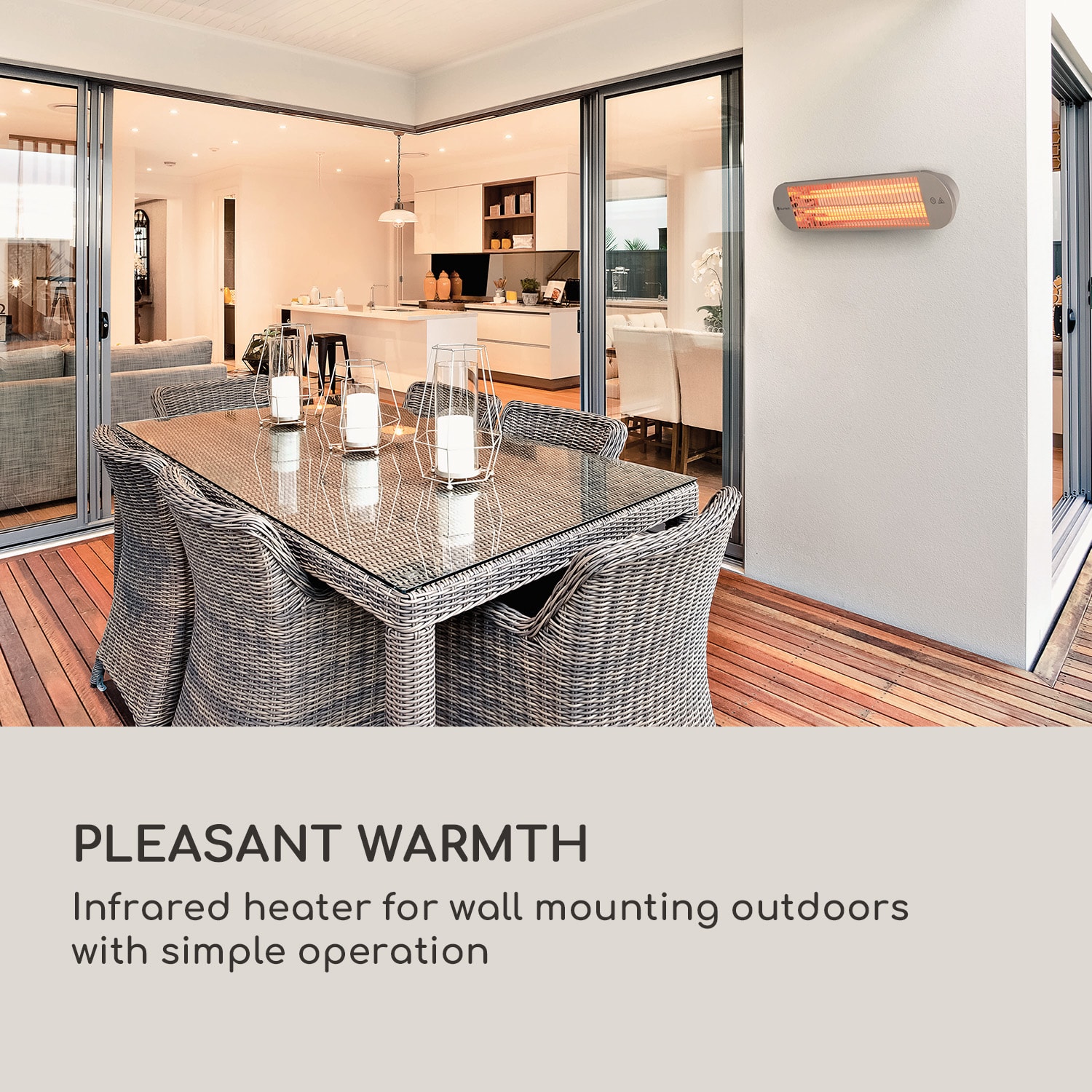 Koniec zábavy, akonáhle zájde slnko? S infračerveným ohrievačom blumfeldt Gold Bar 2000 Swing určite nie! S miesto šetriacim, efektívnym nástenným ohrievačom zábava večer ešte len začína. Keď klesnú teploty, jednoducho pomocou diaľkového ovládača zapnete želaný stupeň ohrievania a hneď vdýchnete každej párty nový život. Takto môžete až do neskorej noci večerať vonku v prírode.Ľahký elektrický ohrievač blumfeldt Gold Bar 2000 Swing sa dá jednoducho upevniť na stenu a nestojí tak v ceste, zatiaľ čo sú hostia na terase ohrievaní z vrchu, rýchlo a efektívne, s výkonom 2000 wattov. Pritom využíva technológia IR ComfortHeat princíp slnečného žiarenia. Cielene sú ohrievané objekty a osoby za pomoci 3 stupňov ohrievania 800, 1200 a 2000 wattov, bez toho aby sa ohrieval okolitý vzduch. Takto dokonca ani ľahký vánok neovplyvní výkon ohrievača. Vďaka zapínateľnej, automatickej 60° oscilácie, bude ohrievač vykonávať horizontálny kývajúci pohyb, ktorý teplo rovnomerne rozšíri do priestoru a tak spoľahlivo zabezpečí dostatok tepla aj pri väčšom počte ľudí. S praktickým diaľkovým ovládačom sa dá pohodlne, v priebehu sekúnd, zmeniť stupeň ohrievania a tak prispôsobiť požiadavkám na teplo. Takto môžete naplánovať záhradné párty, oslavy alebo večere, bez toho aby ste si robili starosti s teplotou. Pozlátené infračervené trubky redukujú svietivosť ohrievača na minimum, takže si každý môže vychutnať teplo bez oslepenia.Oslavovať až dlho do noci, príjemný čas s priateľmi alebo romantický večer na terase pri víne a sviečkach, kým nesvietia hviezdy na oblohe. Vďaka infračervenému ohrievaču blumfeldt Gold Bar 2000 Swing vám bude až do záverečnej príjemne teplo.Upozornenie: prístroj je vhodný len na vonkajšie použitie.