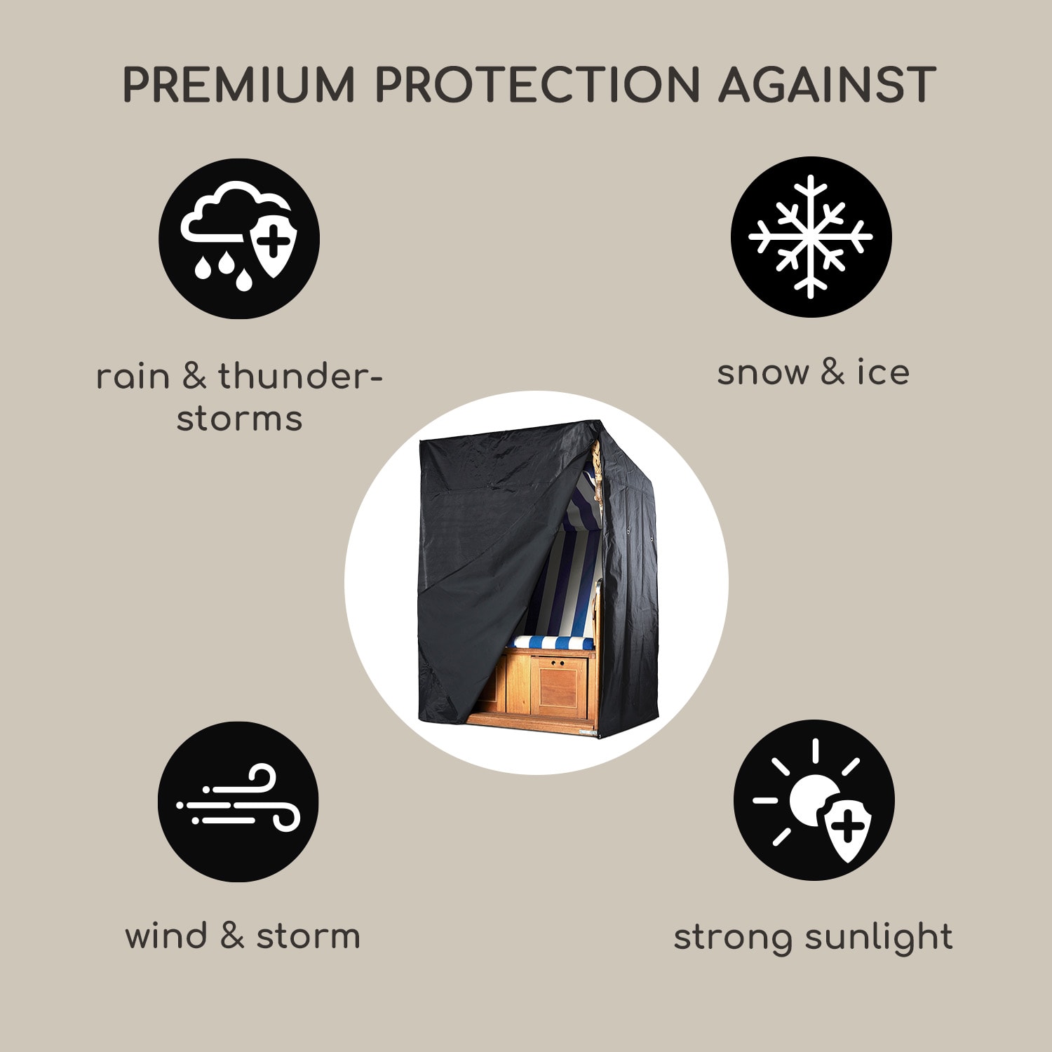 S ochranným plášťom na plážové koše od blumfeldt môžete predĺžiť krásu a životnosť Vášho koša o niekoľko rokov. Je vyrobený so špeciálneho, extra hustého polyestru, ktorý sa teší veľkej odolnosti proti poveternostným podmienkam a dlhej životnosti. Takto neprenikne ani UV žiarenie a vietor, dážď, sneh alebo ľad nemajú žiadnu šancu, aby poškodili Váš kôš. Aj znečistenie životným prostredím je vďaka krytu na kôš minimalizované. Tvorba plesní vylúčená: ochranný kryt má ventilačné otvory, ktoré sa starajú o to, aby bol Váš kôš pevne zabalený, ale napriek tomu priedušný.Kvalitný poťah bezpečne a pevne pripevníte na plážové kreslo pomocou zipsov a utiahnete spodnou šnúrkou.Odolný prémiový ochranný plášť presviedča kvalitou od blumfeldt a chráni Váš plážový kôš pred divokou pieskovou búrkou!