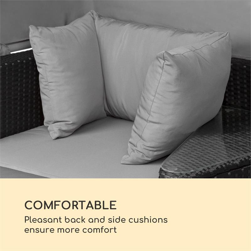 Hľadáš veľkú, mäkkú a pohodlnú záhradnú sedačku na oddych a príjemné stretnutia? S integrovaným priestorom na odkladanie nápojov, kníh alebo občerstvenia? Dvojmiestna sedačka Blumfeldt Heartland ti prináša pohodlie, ktoré si si už dávno zaslúžil.Dvojmiestna pohovka Blumfeldt Heartland s príjemnými sedacími vankúšmi s hrúbkou 8 cm je vkusnou outdoorovou súpravou do tvojho vonkajšieho priestoru. V záhrade, na terase alebo v zimnej záhrade, oáza pohodlia dodá tvojmu prostrediu skvelý akcent. Medzi dvomi sedadlami umiestnený stôl so sklenenou platňou ponúka odkladací priestor na všetko, čo vonku k relaxu potrebuješ. Priehradka pod stolom ti poskytuje ďalšie miesto. Môžeš tu pohodlne uskladniť vankúše, prikrývky a podobne. Všetko, čo potrebuješ na relax a odpočinok, budeš mať vždy po ruke. Keď už hovoríme o oddychu: dodávaný stolček jednoducho premení dvojmiestnu sedačku na veľkú plochu na ležanie. Vylož si nohy a zabudni na všetko. Dva extra vankúše priam pozývajú zdriemnuť si. Budeš mať, samozrejme, dosť miesta pre seba a svojho partnera alebo partnerku a môžete sa spolu tešiť z pobytu v prírode. Dvojmiestna sedacia pohovka Blumfeldt Heartland je určená predovšetkým na odpočinok. Montážna sada je rýchlo zmontovaná a pripravená na použitie. Skladacia strieška proti slnku, ktorá je pripevnená k pohovke, ti poskytne tieň, keď začne slnko príliš páliť, a zároveň ťa skryje pred zvedavými pohľadmi susedov. Poťahy sedačiek a vankúšov sú vyrobené z odolného a ľahko udržiavateľného polyesteru. Vďaka oceľovému rámu je dvojmiestna pohovka Blumfeldt Heartland stabilná a bezpečná. Robustná spodná konštrukcia je zakrytá polyratanovým povrchom, ktorý úžasne zapadne do prostredia tvojej záhrady alebo terasy.Zaži pocit gauča aj vo vonkajšom prostredí! S dvojmiestnou pohovkou Blumfeldt Heartland to nie je žiadny problém.