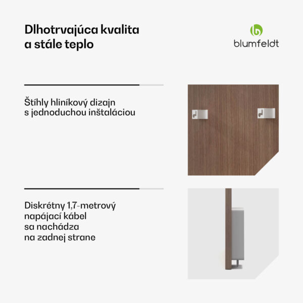 Infračervený ohrievač Blumfeldt Heat Square zaujme svojou inovatívnou technológiou infračerveného vykurovania a ponúka účinný spôsob rýchleho a priameho vykurovania miestností. S výkonom 700 W a 99 % energetickou účinnosťou sa vytvára príjemné teplo, ktoré priamo ohrieva predmety a osoby.Infračervený ohrievač je vybavený WiFi ovládaním, čo znamená, že ho možno pohodlne ovládať pomocou aplikácie alebo dodaného diaľkového ovládača. Certifikát IP44 zaručuje, že tento ohrievač možno bezpečne používať aj v kúpeľniach bez akýchkoľvek obáv o bezpečnosť v súvislosti so striekajúcou vodou. Ich robustné kovové puzdro zaručuje dlhú životnosť a konštantnú distribúciu tepla. Okrem toho sa infračervený ohrievač Blumfeldt Heat Square vďaka špeciálnej povrchovej úprave stáva estetickým prvkom v každej miestnosti a zaručuje jedinečný dizajn. Ohrievač má teplotný rozsah 0 až 37 °C a je vybavený snímačmi na detekciu otvorenia okna a integrovaným termostatom na pohodlnú reguláciu teploty v miestnosti. Jednoduché čistenie povrchu a možnosť skryť kábel za prístrojom zabezpečujú nekomplikovanú manipuláciu a jednoduchú prevádzku infračerveného ohrievača Blumfeldt Heat Square . Zažite teplo a pohodlie, ktoré ponúka infračervený ohrievač Blumfeldt Heat Square .