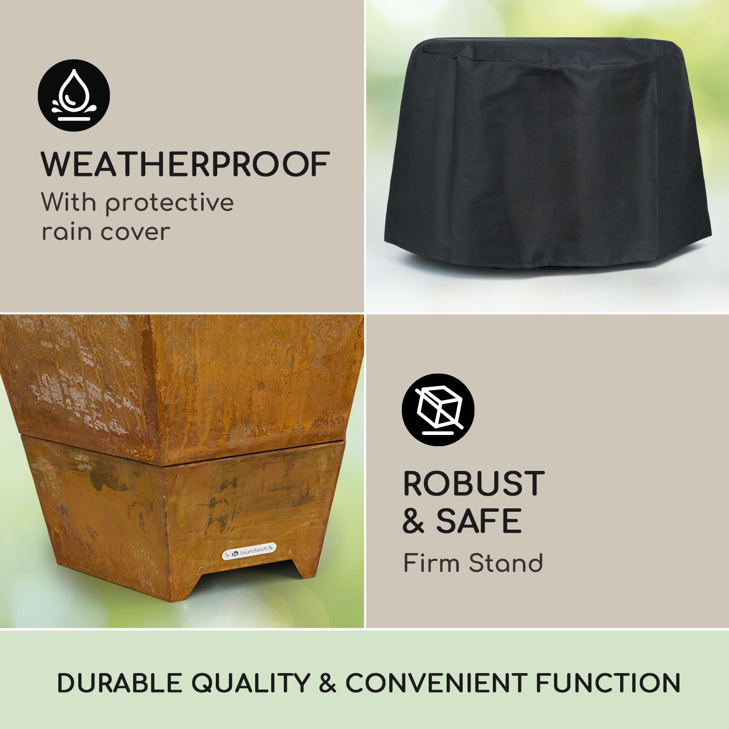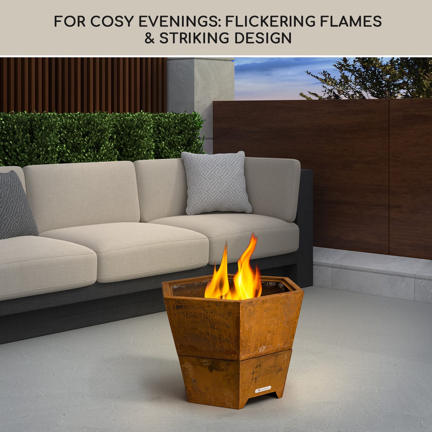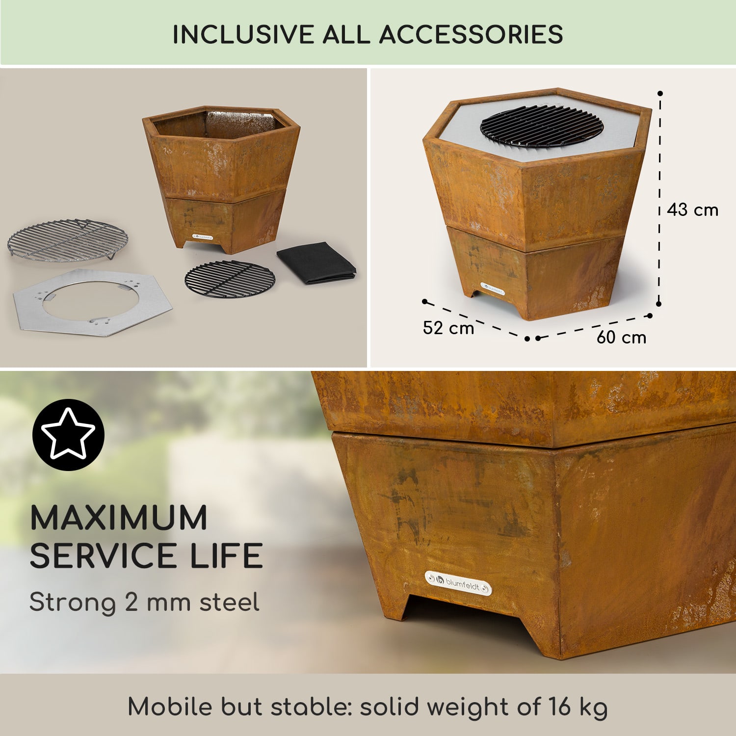 Vychutnajte si šťavnaté grilované pochúťky s rodinou a priateľmi pri ohnisku s grilom Hekla od Blumfeldt a zažite nenapodobiteľnú atmosféru otvoreného ohňa pod hviezdnou oblohou. Atraktívne ohnisko s priemerom 60 cm je celé vyrobené z ocele a pôsobí mimoriadne prirodzeným dojmom. Konštrukcia je chránená pred vodou a mrazom a vďaka hrúbke materiálu 2 mm je aj pomerne ľahká. Sľubuje nádherný pohľad do plameňov, najmä pri používaní palivového dreva, a spoľahlivo chráni pred spáleninami a dierami v záhrade. Umiestnením grilovacieho roštu z nehrdzavejúcej ocele na vrchnú časť sa síce trochu obmedzí horiace plápolanie, ale teplo dreveného uhlia a chuť grilovaných klobás, steakov, zeleninových špízov alebo grilovaného syra túto stratu ľahko vynahradia. Súčasťou balenia je aj praktický rošt na drevené uhlie, pohrabáč a odolná ochrana proti vplyvom počasia, ktorá ohnisko 2 v 1 chráni pred vetrom a inými poveternostnými vplyvmi.Ohnisko s grilom Hekla od blumfeldt: atmosféra praskajúceho plameňa a lahodný pôžitok z grilovania v jednom.