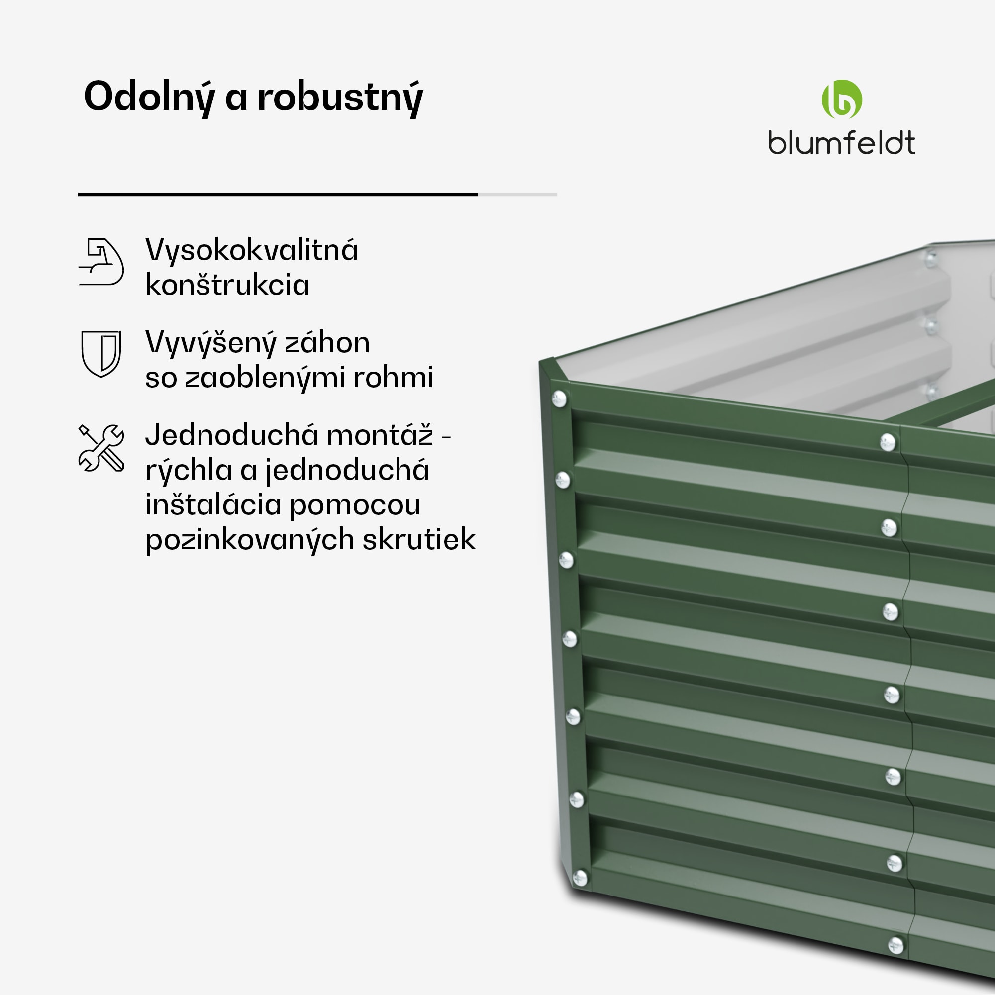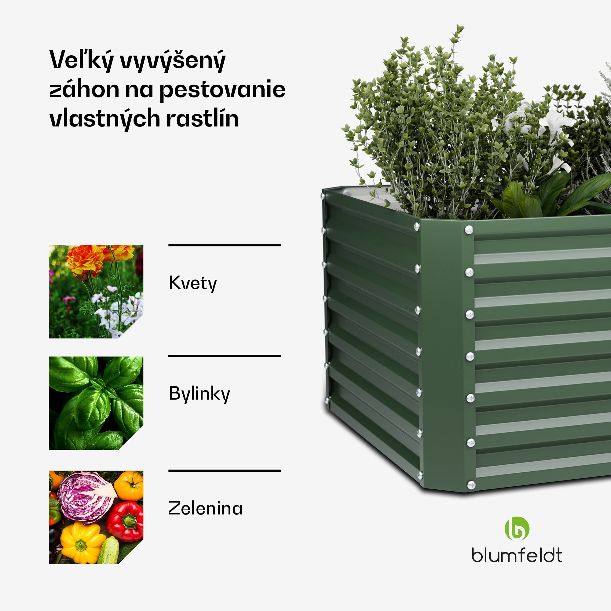 Vyvýšený záhon Blumfeldt High Grow Straight umožňuje ergonomické, odolné a udržateľné záhradkárčenie. S objemom 600 litrov ponúka dostatok priestoru na kvety, bylinky alebo zeleninu.Vyvýšený záhon Blumfeldt High Grow Straight zaujme svojím premysleným štvorcovým tvarom a veľkorysým objemom 600 litrov, vďaka ktorému môžete realizovať rôzne pestovateľské nápady. Je vyrobený z robustnej galvanizovanej ocele, odoláva všetkým poveternostným podmienkam a poskytuje spoľahlivú ochranu proti hrdzi a korózii – ideálny na celoročné používanie v exteriéri. Otvorené dno zlepšuje odvodnenie a podporuje rast koreňov, takže rastliny sú optimálne zásobované živinami. Vyvýšený tvar umožňuje ergonomickú prácu, ktorá minimalizuje namáhanie chrbta a znižuje potrebu ohýbať sa pri sadení a ošetrovaní. Vďaka premyslenej konštrukcii a sklopným bezpečnostným rohom je vyvýšený záhon mimoriadne bezpečný a ľahko sa montuje, takže je vhodný pre začiatočníkov aj skúsených záhradkárov.Dajte priechod svojej kreativite a zažite bezstarostné záhradkárčenie – objavte okrasný vyvýšený záhon Blumfeldt High Grow Straight už teraz!