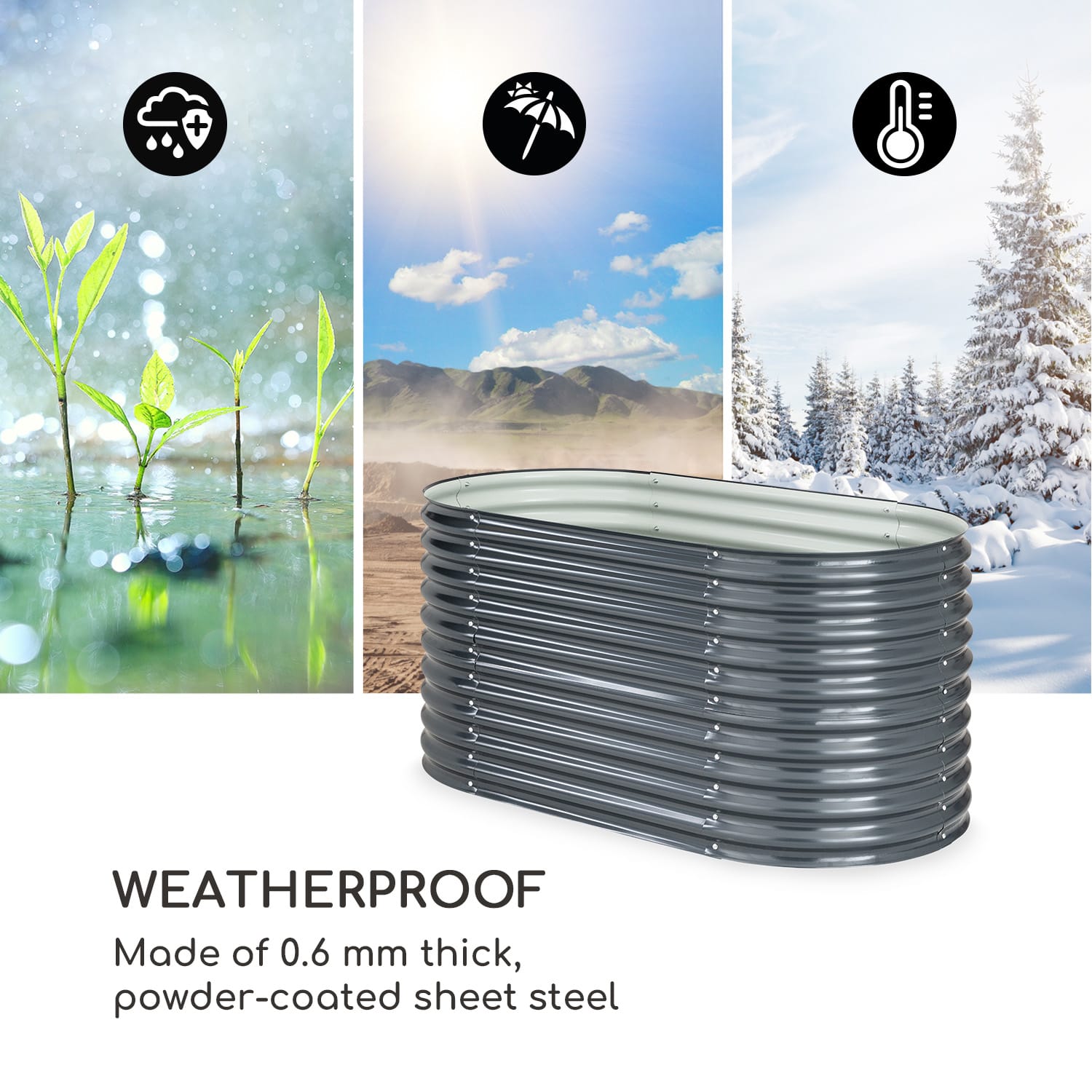 Chutné, čerstvé a z vlastného záhonu: vo vyvýšenom záhone High Grow od blumfeldt môžete pestovať vlastné denné porcie zeleniny a premeniť terasy, dvory alebo predzáhradky na zelené oázy. _x000D_ Pestovanie šťavnatých paradajok, sladkých jahôd, chrumkavých cukiet či aromatických byliniek je vďaka optimálnym podmienkam hračka. Jednoročné rastliny a celoročné potešenie zo záhradkárčenia: Stabilná rámová konštrukcia záhradného záhonu je vyrobená z vlnitého oceľového plechu a je bezpečne chránená proti poveternostným vplyvom špeciálnou zinkovo-hliníkovou povrchovou úpravou. High Grow tak odoláva vetru a počasiu po celý rok._x000D_ Farebná pastva pre oči a zdravá pochúťka pre chuťové bunky: blumfeldt High Grow vytvára optimálne podmienky pre pestovanie. To umožňuje relatívne vyššie výnosy ako obdobné ploché záhony. Záhradkárčenie pohodlne v stoji a predovšetkým s ohľadom na váš chrbát, vás bude baviť ešte viac. Pracovná výška 80 cm je prekážkou aj pre škodcov, ako sú slimáky. _x000D_ Je načase urobiť niečo užitočné: pretože s okrasným vyvýšeným záhonom High Grow od blumfeldt môže každý objaviť svoju záhradkársku dušu.