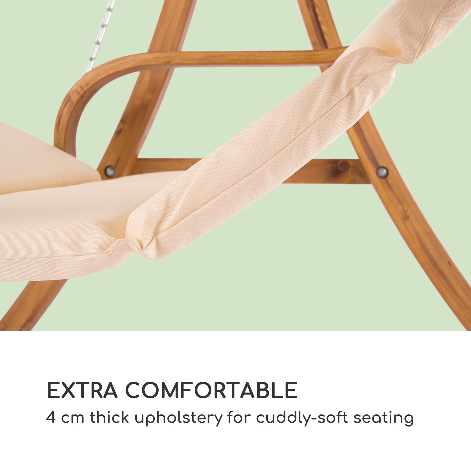 Na drevenej záhradnej hojdačke Blumfeldt Maui možno oddychovať pri hojdání v záhrade a na terase. Jemné hojdanie na plyšovo mäkkom vankúši: Štýlový relax. „Pre hodiny odpočinku v záhrade a na terase.“ Hojdačka Blumfeldt Maui Vám umožní zabudnúť na každodenný život. Na 110 cm širokej, mierne zakrivenej sedačke s 4 cm hrubým polstrovaním sa možno pohodlne hojdať samostatne alebo vo dvojici ako na ležadle. Pevne umiestnená markíza prináša dodatočné zabezpečenie a vytvára príjemný tieň – bez ohľadu na to, kde je hojdačka umiestnená. V otázke stability tiež spĺňa všetky želania. Masívne drevené trámy, reťaze z ušľachtilej ocele a pozinkované skrutky zabezpečia vysokú stabilitu konštrukcie, ktorá môže byť zaťažená až hmotnosťou do 250 kg. Krémová biela markíza a voči proti poveternostným vplyvom odolný lazúrovaný smrekovec prinesú letnú náladu do každého prostredia. „Štýlový komfort a vysoká nosnosť: 110 cm široké sedadlo so 4 cm hrubým polstrovaným sedadlom a markízou proti slnku. Maximálne zaťaženie 250 kg vďaka použitiu smrekovcových nosníkov a reťazí z ušľachtilej ocele.“ S hojdačkou Blumfeldt Maui sa stane záhrada a terasa letným útočiskom pokoja. Táto drevená záhradná hojdačka je ideálna pre každého, kto hľadá kombináciu štýlu a funkčnosti. Dostupné varianty: hojdačka s markízou, hojdačka so strechou proti slnku (produkt 10029200) Vezmite, prosím, na vedomie, že pravé drevo pracuje a je premenlivé počasím: Praskliny alebo zafarbenie dreva sú normálne a podčiarkujú jedinečný charakter produktu. Nemajú vplyv na bezpečnosť hojdačky. Ak chcete zachovať ochranu dreva, mal by byť opakovane nanesený ochranný náter drevených častí podľa potreby a poveternostných vplyvov približne raz za 1 až 2 roky.