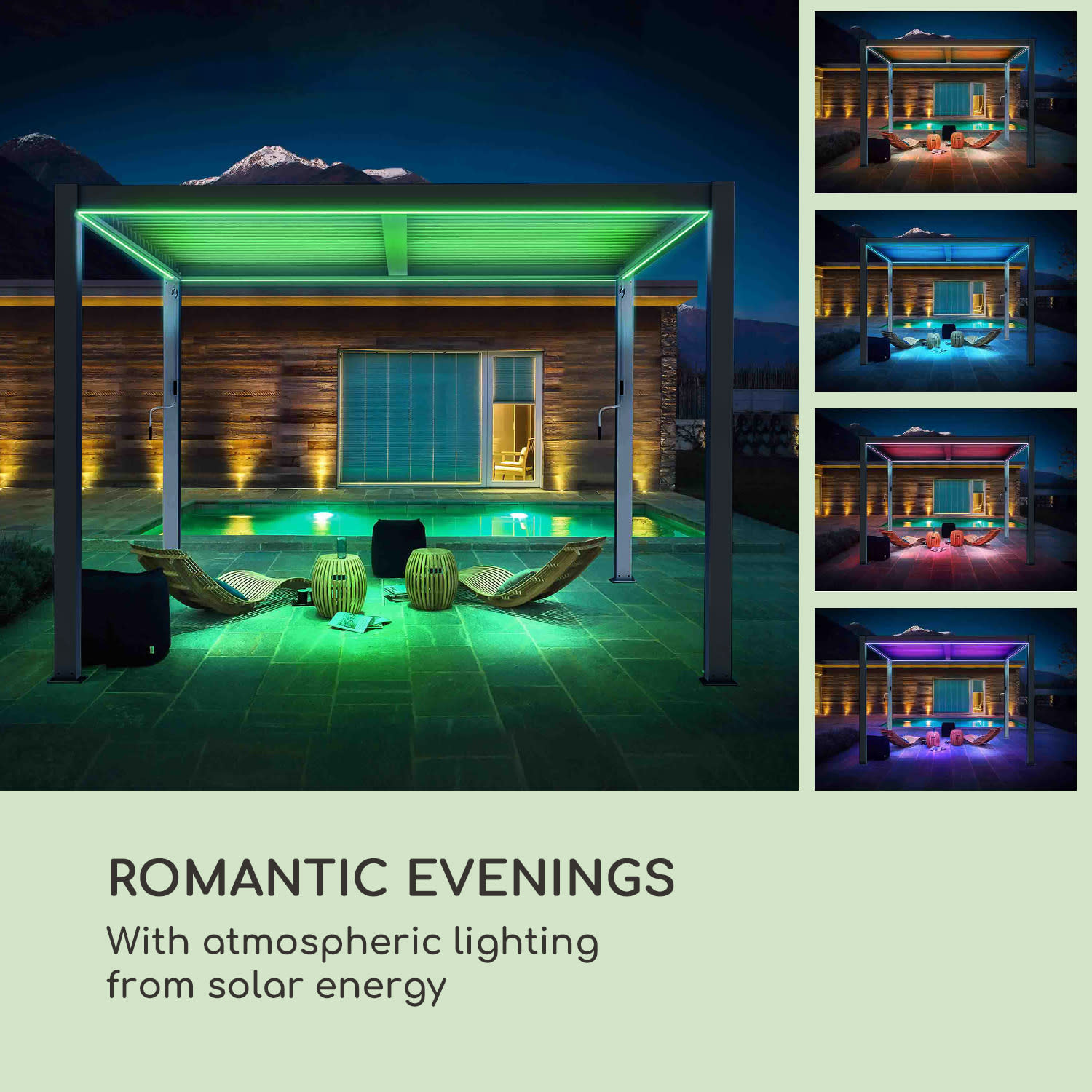 Božské záhradné sídlo s ázijským nádychom! Pergola od spoločnosti blumfeldt Pantheon Climax Ambient sa stane chrámom odpočinku, ktorý je zároveň dobre chránený pred poveternostnými vplyvmi.S pergolou blumfeldt Pantheon spravíte zo svojej terasy alebo posedenia v záhrade zónu odpočinku nezávislú od počasia. Kompletná súprava pergoly obsahuje všetko, čo je potrebné na to, aby sa plocha 3 × 3 metre zmenila s minimálnym úsilím na dobre tienené miesto. Rám vyrobený z profilov 10 × 10 cm s hrúbkou materiálu 1,6 mm je nielen mimoriadne stabilný, ale vďaka zhotoveniu z práškového lakovaného hliníka je aj veľmi ľahký. Perfektné pre dlhodobé potešenie z oddychu vo vonkajšom prostredí – úplne bez škvŕn od hrdze na podlahe terasy. Bioklimatická strecha ponúka optimálnu ochranu zhora: pred slnkom, dažďom alebo vetrom. Predovšetkým počas horúcich letných nocí je táto pergola perfektným prístreškom. Vďaka hliníkovým panelom vzduch prúdi dovnútra i von: vzniká tým efekt vetrania, ktorý osviežujúco rozhýbe stojace teplo. Solárne osvetlenie okrem toho vytvára slávnostnú alebo romantickú náladu. Malé LED diódy sú umiestnené okolo strechy ako svetelná reťaz.Doprajte si čerstvý vzduch za každého počasia – s pergolou od spoločnosti blumfeldtPantheon. Párty so susedmi, futbalový večer vonku alebo detská narodeninová oslava: táto exkluzívna pergola poskytuje pri každej príležitosti dobre klimatizované prostredie! Zároveň je moderným exteriérovým doplnkom!