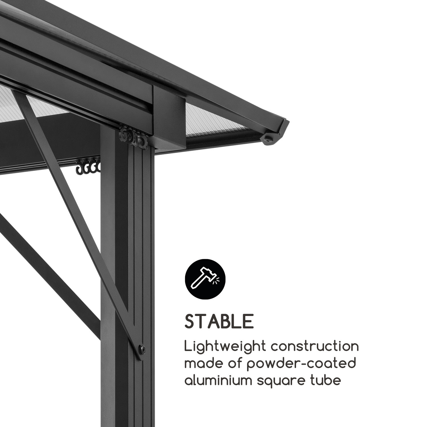 Pavilón blumfeldt Pantheon Solid Sky Ambient Solar premení terasu alebo záhradné posedenie na zónu odpočinku. Vďaka svojmu elegantnému dizajnu pavilón zapadne do každého záhradného prostredia a s osvetlením sa postará o útulnú atmosféru.Pergola blumfeldt Pantheon Solid Sky Ambient Solar nielenže spraví sedaciu časť v záhrade odolnou proti dažďu, ale vďaka svojej tónovanej strešnej krytine poskytne aj upokojujúci tieň s plochou 3 × 4 metre. Počas súmraku môžeš pohodlne zapnúť 56 malých svetiel. Akumulátor sa cez deň nabíja slnečným žiarením, môžeš ho však nabíjať aj cez USB. Konštrukcia z 7,6 × 7,6 cm stĺpikov s hrúbkou materiálu 1,2 mm je nielen maximálne stabilná. Vďaka zhotoveniu z práškovo lakovaného hliníka je tiež veľmi ľahká. Altánok je ideálny na dlhodobý oddych vo vonkajšom prostredí – bez hrdzavenia.Špicatá strecha pavilónu je vyrobená z pevných, 6 mm hrubých, dvojstenných polykarbonátových dosiek, aby si mohol pokojne ostať oddychovať aj počas letných dažďových prehánok. Dosky sú nielen vodotesné, ale tiež extrémne robustné a takmer nerozbitné vďaka svojej štruktúre s dutými komorami. Sú tónované, no prepúšťajú svetlo, čo zaručuje špeciálnu atmosféru so súčasnou ochranou pred slnkom. Vďaka solárnemu osvetleniu si môžeš vychutnávať s priateľmi alebo rodinou v chránenom prostredí aj príjemné letné noci! Pomocou funkcie stmievania na prepínači môžeš atmosféru podľa potreby dotvoriť teplým bielym svetlom.O viac pohodlia v osvetlenom pavilóne sa postarajú voliteľne dostupné bočné panely, ktoré chránia pred slnkom, vetrom a počasím, ako aj pred zvedavými pohľadmi susedov.Uži si slnečné dni a pôsobivé letné noci: pavilón blumfeldt Pantheon Solid Sky Ambient Solar.