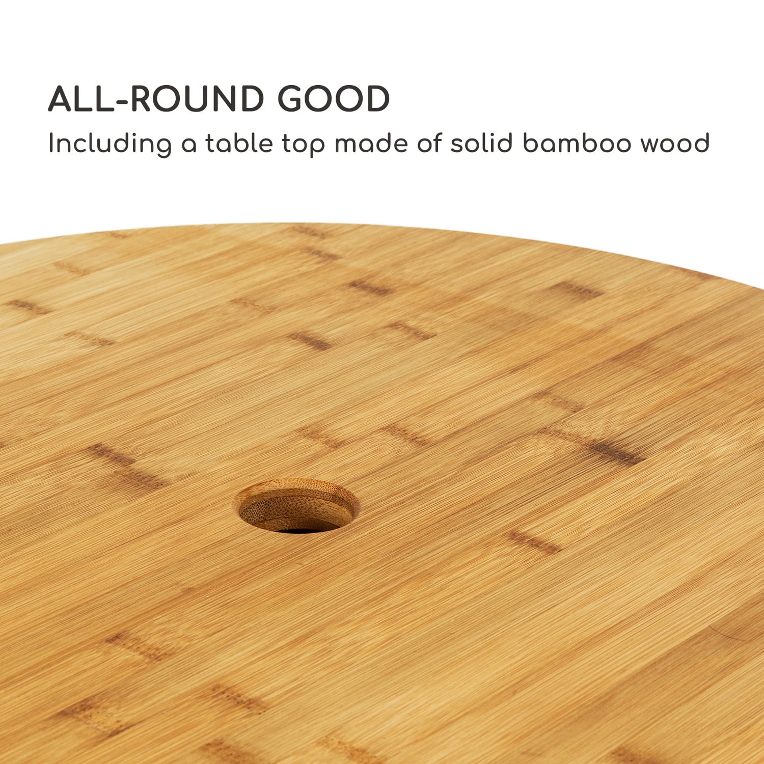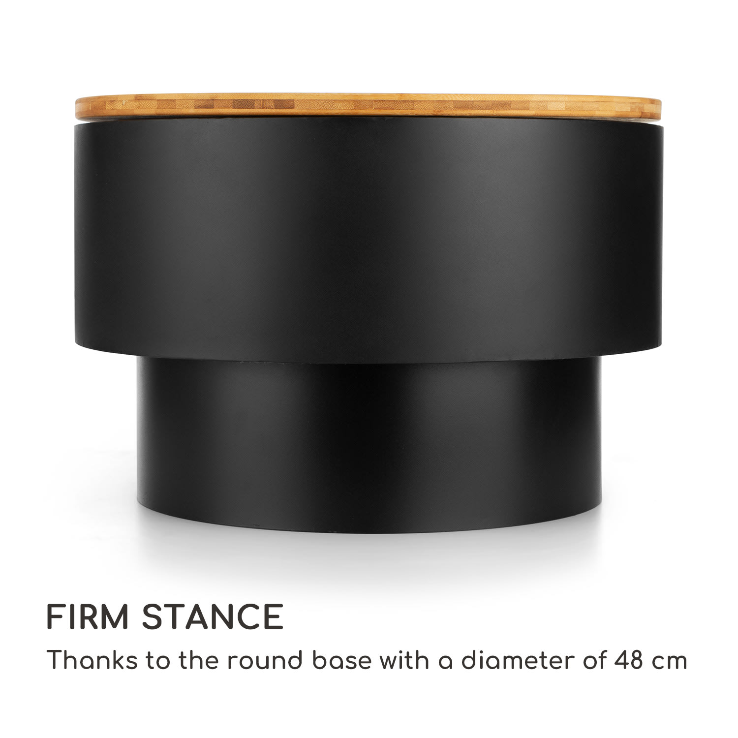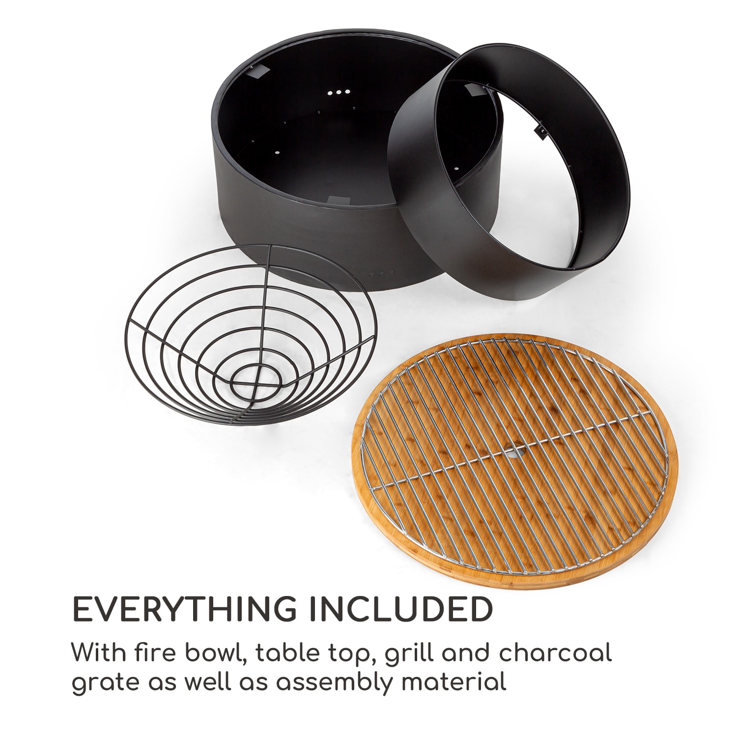 Ohnisko s grilom blumfeldt Pompeji je kombinácia grilu, ohniska a stolíka.Užívaj si večer v záhrade alebo na terase: s ohniskom a grilom blumfeldt Pompeji vám urobí tri krát takú radosť. V ohnisku s priemerom 60 cm šíria drevené polená, uhlie alebo brikety s plápolajúcimi plameňmi príjemné teplo a atmosféru táborového ohňa. Pevný obal je vyrobený z 2,5 mm hrubej ocele a je pokrytý žiaruvzdornou farbou – tak je robustný a chránený voči poveternostným vplyvom. Ale chutný začne byť, ak na ohnisko Pompeji nasadíte 56 cm širokú pochrómovanú grilovaciu mriežku. Stačí jednoducho položiť mriežku na ohnisko a hneď môže začať zábava s grilom. Kruhová základňa s priemerom 48 cm sa stará o bezpečnú stabilitu ohniska Pompeji, či už pri používaní ako gril alebo ako táborák. Avšak vďaka bambusovej doske, ktorá je súčasťou balenia, môžeš ohnisko Pompeji zmeniť na štýlový záhradný stolík. Kruhový tvar a elegantná čierna sa hravo hodia do každej záhrady alebo na terasu.Romantika, teplo a chutné jedlo sú zjednotené v ohnisku a grile blumfeldt Pompeji.