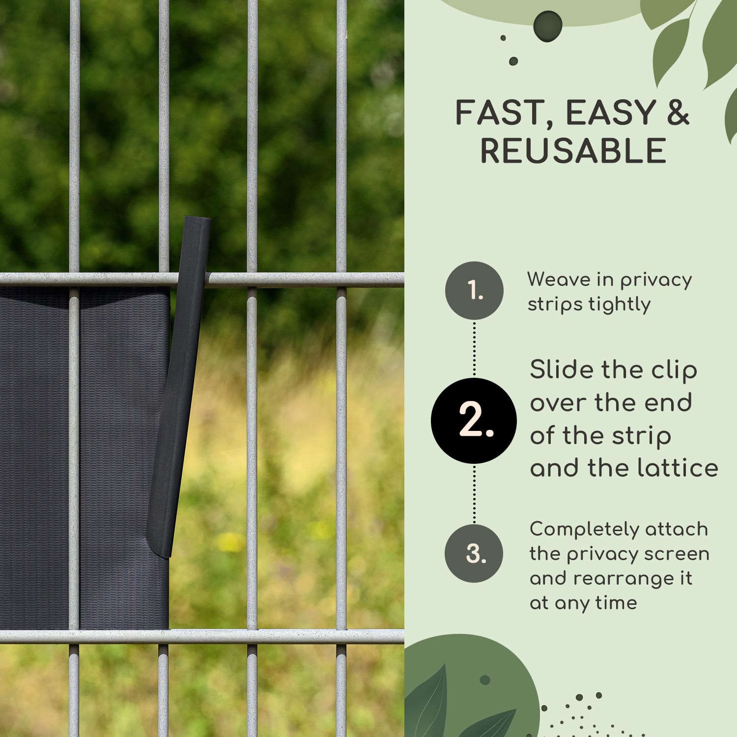 Chceš si chrániť svoje súkromie na záhrade kvalitnými tieniacimi pásmi od spoločnosti Blumfeldt Winter & Bani? Tu získaš vhodné príslušenstvo pre individuálny dizajn tvojho plotu: kvalitné spony, odolné proti poveternostným vplyvom, ti umožňujú veľmi jednoduchú montáž. Jednoducho vlož do spony koniec tieniacej pásky a oboje pripevni k príslušnej tyčke mriežky plotu. Niekoľko jednoduchých krokov ti zaručí pevné pripojenie. Tieniace pásy môžeš odstrihnúť na ľubovoľnú dĺžku a vhodne zafixovať na oboch koncoch svojho plotu.Upevňovacie klipy Blumfeldt Winter & Bani sedia na bežné mriežkové ploty s 20 cm rozstupom vodorovných tyčí v mriežke a s priemerom tyčiek 5 – 6 mm.Oddýchni si v súkromí a chránený pred vetrom: s upevňovacími sponami môžeš ľahko a bezpečne namontovať tieniace pásy Blumfeldt Winter & Bani!