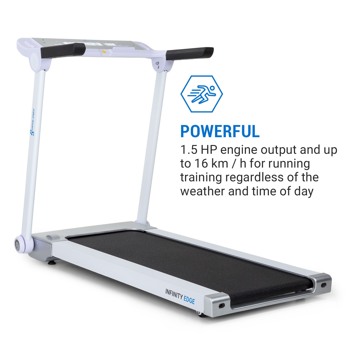 Váš domov, Vaša telocvičňa: multimediálny bežecký pás s výkonom motora 1,5 PS a SoftDynamic Suspension System spolu so SmartCardio Studio na kardio tréning bez ohľadu na čas alebo počasie.Multimediálny bežecký pás: integrovaná dotyková LED obrazovka s Bluetooth pripojením na ovládanie bežeckého pásu a pripojenie k tabletu alebo smartfónu s integráciou Kinomap pre rozmanitý tréning.Najlepšia technológia: nastaviteľná rýchlosť behu až do 16 km/h, 12 bežeckých programov napr. na horský beh alebo šprintérsky tréning, ako aj integrované reproduktory s multimediálnym prehrávačom pre najlepšiu hudbu počas tréningu.Bežte slobodne! S bežeckým pásom série Infinity od Capital Sports sa váš kardio tréning stane zážitkom na vysokej úrovni! Bežecký pás Infinity Edge od Capital Sports prináša najnovšiu technológiu bežeckých pásov pre váš vytrvalostný a kardio tréning s extra veľkou bežeckou plochou a vďaka dotykovej LED obrazovke s pripojením Bluetooth ho ľahko prepojíte s tabletom alebo smartfónom. Je vybavený aj mnohými komfortnými funkciami, ako sú integrované reproduktory a systém SoftDynamic Suspension pre mimoriadne prirodzené správanie sa počas behu, vďaka ktorému takmer zabudnete, že trénujete – bez ohľadu na počasie alebo čas!Vitajte v multimediálnom tréningu budúcnosti: vďaka pripojeniu Bluetooth vám bežecký pás Infinity Edge od Capital Sports otvorí svet Kinomap pre váš domáci tréning. Potrebujete k behu vizuálne podnety? Žiadny problém, stačí získať prístup k tisícom videí skutočných bežeckých trás a preskúmať ich počas tréningu. Samozrejme, mini počítač má aj možnosť zdieľať výsledky tréningu priamo do vášho inteligentného zariadenia. Mimoriadne praktické: cez USB port alebo 3,5 mm AUX vstup môžete do integrovaných reproduktorov pustiť hudbu podľa vlastného výberu a dodať tréningu ten správny zvuk. Aby bol váš tablet alebo smartfón v bezpečí, má bežecký pás Infinity Edge od Capital Sports k tomu určený vhodný držiak. Samozrejme, môžete aj pozerať filmy, čítať knihy alebo surfovať po internete, zatiaľ čo beháte.Nielen z hľadiska multimédií dosahuje bežecký pás Infinity Edge od Capital Sports špičkové parametre: veľká bežecká plocha 45 x 125 cm, výkon motora 1,5 ps a rýchlosť až 16 km/h zabezpečujú tie správne tréningové nároky, či už pre bežeckých začiatočníkov alebo maratónskych veteránov. Rýchlosť môžete samozrejme ovládať priamo prostredníctvom rukovätí s integrovaným snímačom tepovej frekvencie alebo na veľkom dotykovom LED displeji. Môžete si vybrať z 12 prednastavených tréningových programov a 3 užívateľsky definovaných režimov alebo skontrolovať parametre svojho tréningu, ako je pulz, prejdená vzdialenosť a spálené kalórie. Odpruženie SoftDynamic Suspension, ktoré vďaka viacvrstvovému systému mimoriadne jemne tlmí pás, zaručuje mimoriadne príjemný, prirodzený pocit pri behu ako po lesnej cestičke.Po tréningu je zároveň pred tréningom: bežecký pás Infinity Edge od Capital Sports možno pomocou inovatívneho skladacieho systému ľahko zložiť na mimoriadne priestorovo úsporné rozmery a ľahko premiestniť pomocou integrovaných podlahových koliesok. Bežecký tréning v tej najlepšej forme: s bežeckým pásom Infinity Edge od Capital Sports .Upozorňujeme, že používanie aplikácie tretej strany „Kinomap“ môže byť spoplatnené.