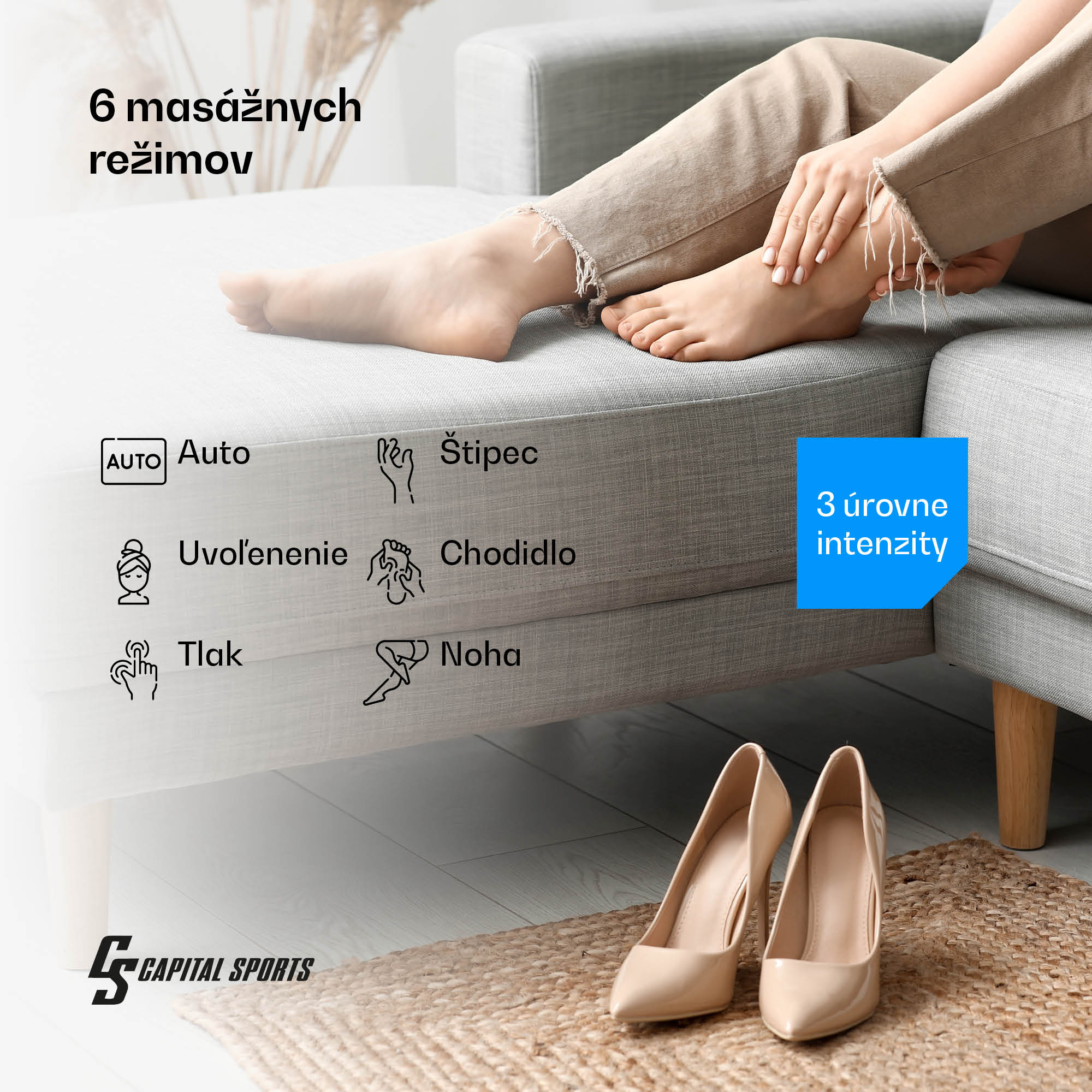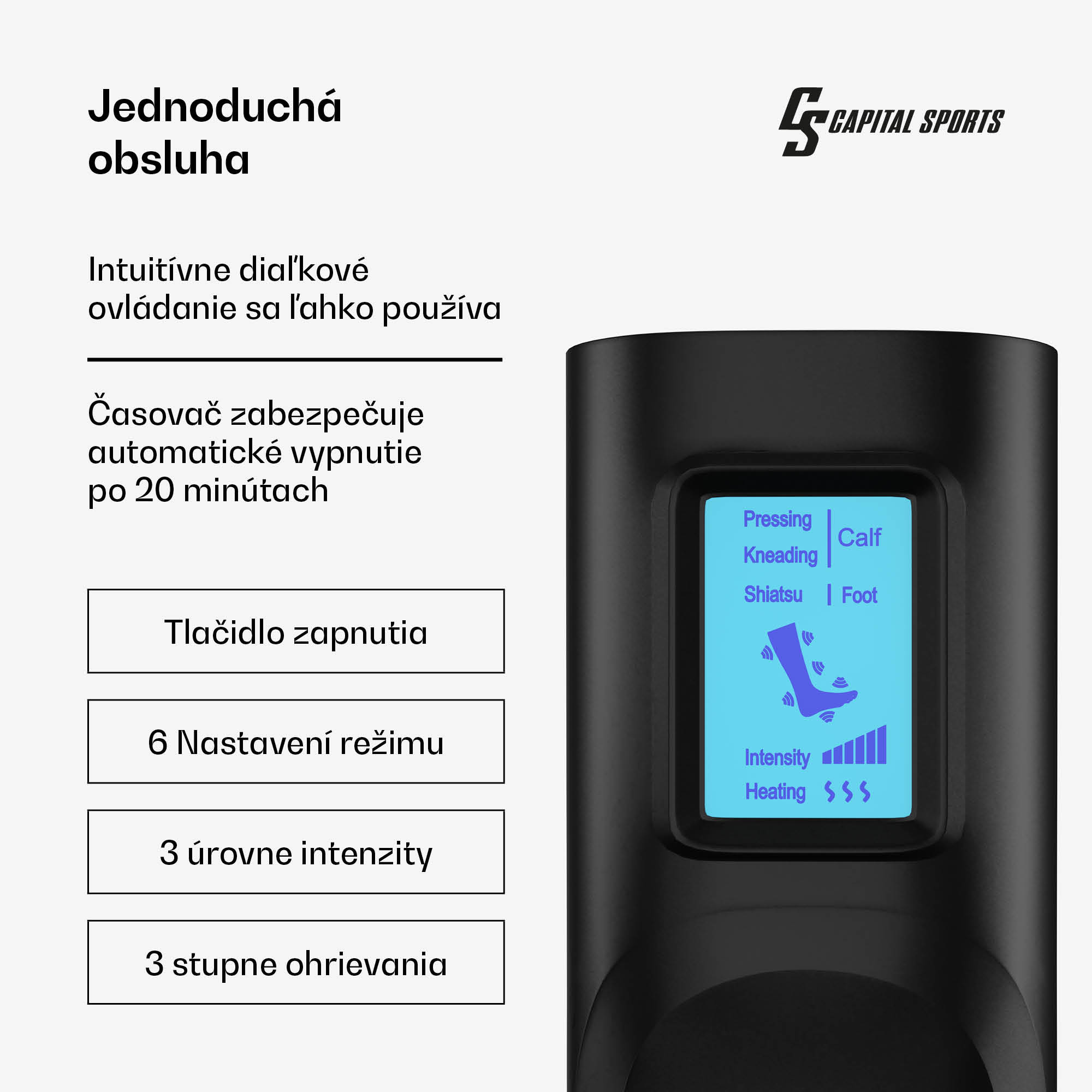 Masážny prístroj ReCrest ponúka upokojujúcu masáž lýtok a chodidiel. Zmierňuje napätie po dlhom dni a oživuje unavené nohy po behu.Masážny prístroj ReCrest od spoločnosti Capital Sports má štyri samostatné tlakové komory, ktoré sa zameriavajú na rôzne oblasti nôh. Celkom päť masážnych režimov umožňuje aj individuálne ošetrenie chodidiel a lýtok. Podľa svojich potrieb si môžete vybrať z troch úrovní intenzity – takže si môžete vychutnať relaxačnú masáž na pohovke alebo stimulovať nohy po intenzívnom tréningu. Masážny prístroj na chodidlá Capital Sports ReCrest možno pohodlne ovládať pomocou diaľkového ovládača alebo príslušných tlačidiel na vonkajšej strane. Dvadsaťminútový automatický časovač potom ukončí masáž v správnom čase a umožní vám aj krátky spánok počas relaxačnej samoobslužnej procedúry.Masážny prístroj Capital Sports ReCrest je vyrobený z hygienického a ľahko čistiteľného ABS a sieťoviny. Samotné zariadenie by sa nikdy nemalo ponárať do vody.Ľudia s kožnými infekciami, osteoporózou, vysokým krvným tlakom, cukrovkou, srdcovými chorobami a inými závažnými ochoreniami, ako aj tehotné ženy by sa mali pred prvým použitím výrobku krátko poradiť so svojím lekárom.Aby sa ťažké chodidlá po dlhom dni cítili opäť ľahké ako pierko – masážny prístroj Capital Sports ReCrest sa vďaka mnohým masážnym režimom postará o zaručené uvoľnenie.