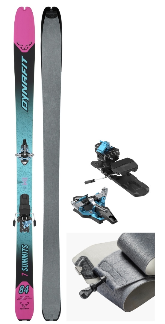 Sada obsahuje turistické lyže Seven Summits, ktoré sú rokmi osvedčenou klasikou vo flotile lyží DYNAFIT. Plné ABS bočnice zaručujú najlepší možný prenos sily na lyže. Bez ohľadu na to, kam zamierite, so Seven Summits ste ideálne vybavení pre všetky typy snehu a akýkoľvek druh terénu. V porovnaní s ostatnými modelmi lyží DYNAFIT je vďaka rozšírenému polomeru otáčania Seven Summits lyža veľmi zhovievavá. Celodrevené jadro z topoľa zároveň prepožičiava potrebný pop a hladkú jazdu bez vibrácií. Rocker konštrukcia na špičke a päte a sidecut sú taktiež prispôsobené pre každú veľkosť lyží – unikátna vlastnosť na trhu skitouringu. To udržuje efektívnu dĺžku hrany rovnako úmernú každej veľkosti, čo umožňuje fungovať nezávisle na veľkosti.