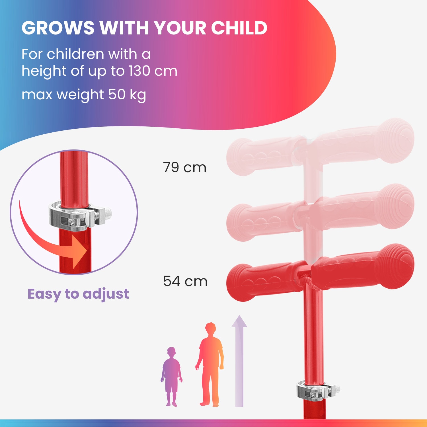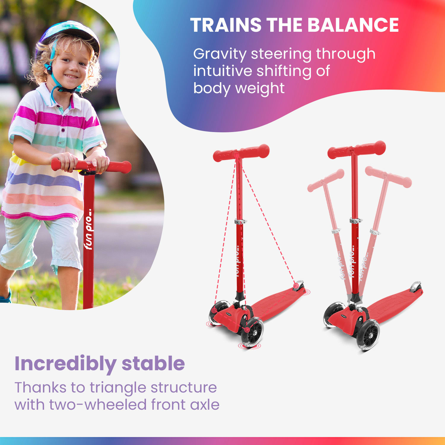 Kolobežka fun pro ONE Deluxe ponúka veľa zábavy pre deti vo veku 3-6 rokov vďaka stabilnej prednej náprave s dvoma kolesami. Verzia Deluxe je vizuálne pôsobivá s eloxovanou rukoväťou s bielymi nápismi. Vďaka príjemnému gravitačnému riadeniu sa detská kolobežka riadi celkom pohodlne prenášaním hmotnosti tela. Tento princíp riadenia je založený na cyklistike a precvičuje sa tak rovnováha. Ďalšou zaujímavosťou tejto štýlovej kolobežky sú jasne svietiace LED kolesá, ktoré vďaka dynamu nevyžadujú výmenu batérie. Bezpečnosť zaisťujú kovové výstuhy na podvozku a spoľahlivá trecia brzda na zadnom kolese. Vďaka skladaciemu a výškovo nastaviteľnému riadidlu sa dá kolobežka tiež ľahko zložiť a uložiť.