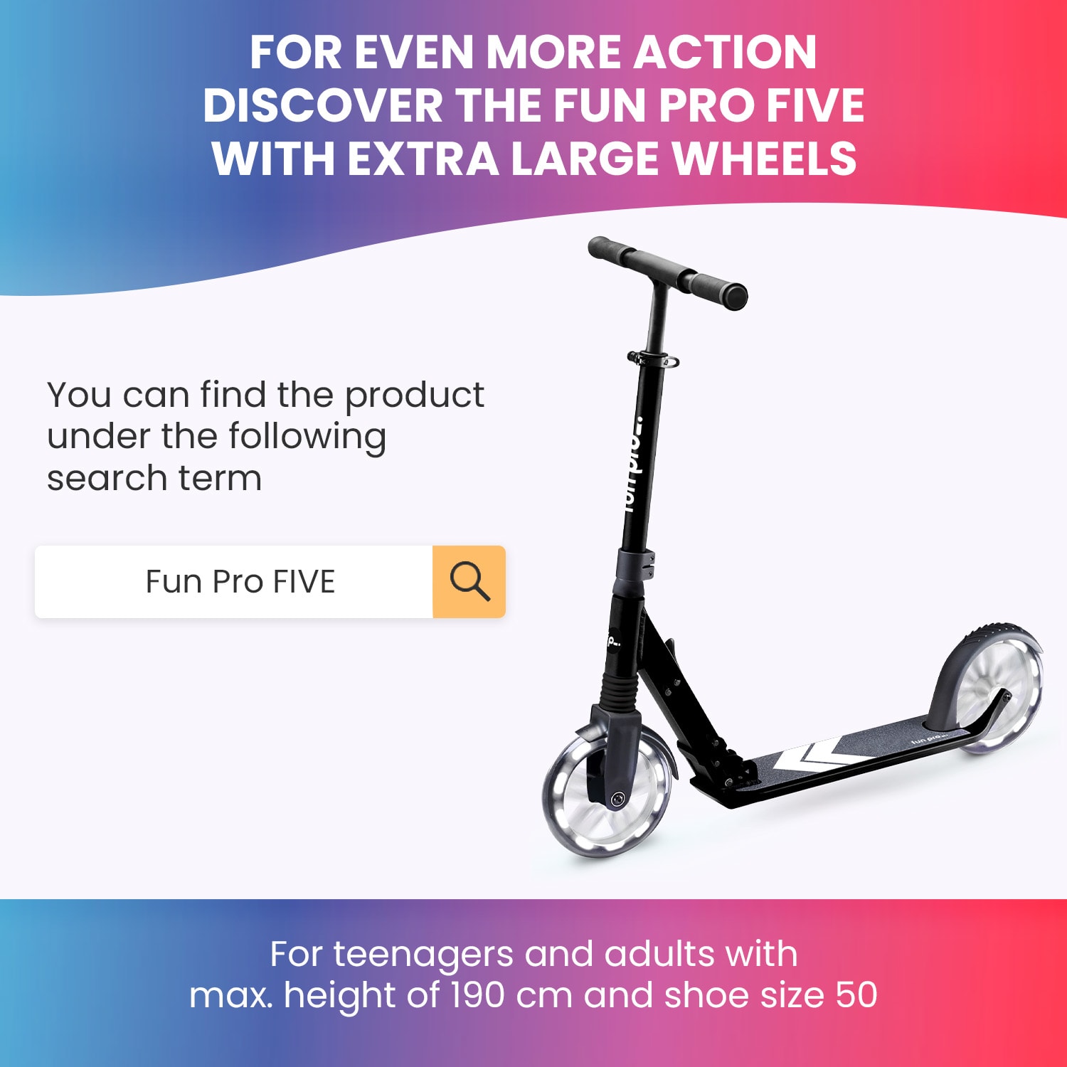 Zábava na kolobežke pre veľké deti! NaÅ¡a fun pro THREE detská kolobežka je vhodná pre vÅ¡etky deti a mládež vo veku 6 – 18 rokov, ktorà uprednostňujú jazdu na dvojkolesovej kolobežke. Kolobežka unesie až 100 kg a má plynulo nastaviteľné riadidlá od 74 do 93 cm: ideálne pre výšku od 110 do 160 cm. Riadidlá sa dajú ľahko zložiÅ¥ a dokonca aj konce riadidiel sa dajú pohodlne zložiÅ¥ dovnútra. Oba mechanizmy sú optimalizované, sedia veľmi Äisto a poÄas jazdy nedrnÄia. Kolobežka je teda naozaj vhodná na použitie vo verejnej doprave a zaberá málo miesta. Prepravu uľahÄuje aj popruh na prenášanie. Kolesá z PU s priemerom 120 mm a guľôÄkovými ložiskami ABEC 9 ponúkajú veľký pohon a zároveň sú obratné a ľahké. Tak ako vÅ¡etky naÅ¡e kolobežky, aj kolobežka fun pro THREE má treciu brzdu na zadnom kolese, ktorá zaisÅ¥uje potrebnú bezpeÄnosÅ¥. Rozkladacà stojan uľahÄuje parkovanie a chráni riadidlá pred odreninami.