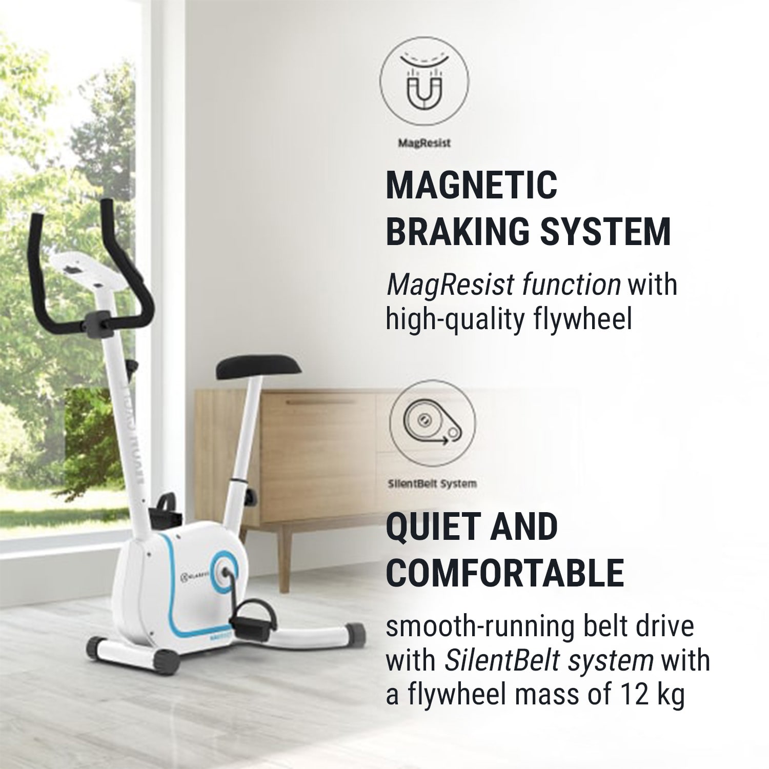 Vďaka remeňovému pohonu s hladkým chodom, viacstupňovému odporu a magnetickému brzdovému systému môžete domáci trenažér Klarfit Myon Cycle kedykoľvek bez problémov jednoducho rozhýbať. Vďaka veľmi kvalitnému remeňovému pohonu so systémom SilentBelt pracuje domáci trenažér veľmi plynulo a potichu. Ideálnu silu nášľapu zabezpečuje odpor s celkovo 8 úrovňami, ktorý zaručuje efektívny tréning vďaka rozličným úrovniam. Magnetický brzdový systém s funkciou MagResist zaujme presným a spoľahlivým procesom brzdenia, ktorý je okrem toho mimoriadne šetrný k materiálu. Výškovo nastaviteľné sedadlo vás vždy uvedie do správnej polohy pre sústredený a náročný tréning. V pohodlných držadlách je zabudovaný monitor pulzu, ktorý poskytuje tréningovému počítaču aktuálne dáta o frekvencii pulzu, čo umožňuje efektívnu kontrolu výkonu. Tréningový bicykel so zotrvačníkom s hmotnosťou 12 kg má tiež držiak na tablet SmartCardio Studio, ktorý umožňuje umiestnenie vhodného zariadenia a teda popri tréningu ponúka aj všestrannú zábavu. Používaním aplikácie Kinomap môže okrem toho fotoaparát vášho tabletu alebo smartfónu rozpoznávať vaše pohyby a umožní vám tak preskúmať mnoho virtuálnych tratí. Protišmykové pedále s nastaviteľnými popruhmi chodidiel tiež pomáhajú pri zabezpečení optimálneho prenosu energie z nohy na pedál, zatiaľ čo praktické transportné kolieska zaručujú flexibilné premiestňovanie pevnej oceľovej konštrukcie. Fitnes je skutočne zábava: domáci cyklotrenažér Klarfit Myon Cycle kombinuje všetky dôležité komponenty pre produktívny a zároveň šetrný tréning v jednom športovom zariadení.