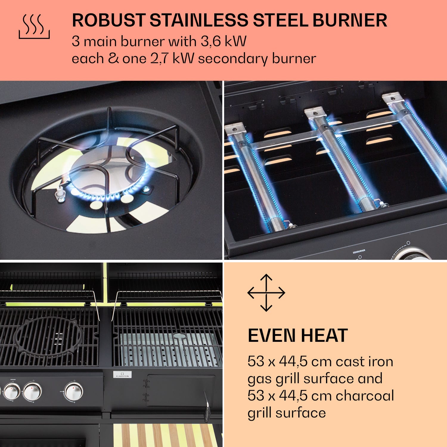 Rozpáľte to ako majster grilovania: Kombinovaný záhradný gril Aberdeen od Klarstein môžete rozpáliť buď klasickým dreveným uhlím alebo plynom. Vďaka extra veľkej grilovacej ploche môžete lahodnými grilovanými špecialitami rozmaznávať mnoho hostí zároveň. Vynikajúce klobásy, grilovaný syr, zelenina a bravčové a hovädzie mäso pripravené na dizajnovom grile na plyn a drevené uhlie, ktorý môžete v záhrade jednoducho presúvať pomocou dvoch koliesok.Zažite maximálny komfort grilovania a ideálne rozloženie tepla: Oheň môžete bezpečne a pohodlne rozložiť na prednej klapke a kedykoľvek ho jednoducho kontrolovať. Vďaka jednoduchému mechanizmu môžete celé ohnisko ľubovoľne zdvíhať a spúšťať, takže sa vaše jedlo bude smažiť vždy v dokonalom teple. K dispozícii je šesť rôznych polôh na umiestnenie žeravého uhlia do správnej vzdialenosti od grilovacieho roštu, zatiaľ čo bočné stolíky vám ponúkajú dostatok priestoru na prípravu a skladovanie. Zároveň môžete na plynovom grile pritom variť, piecť a vyprážať, s tromi výkonnými horákmi z nehrdzavejúcej ocele a pripravovať všetky druhy príloh na bočnom horáku. Integrované teplomery v príslušných krytoch vám tiež umožnia ideálnu kontrolu tepla, kryty z nehrdzavejúcej ocele ponúkajú ochranu proti vetru a robia z kombinovaného grilu dokonalú udiareň. Integrovaný otvárač na fľaše, praktické háčiky na grilovacie náčinie alebo utierky, spodná polica a príjemná rukoväť robia grilovanie dokonalým! Nikto nebude hladný: pojazdný kombinovaný záhradný gril na plyn alebo drevené uhlie Klarstein Aberdeen je štýlovým majstrom grilovania pre rozsiahle BBQ akcie vo veľkých skupinách!