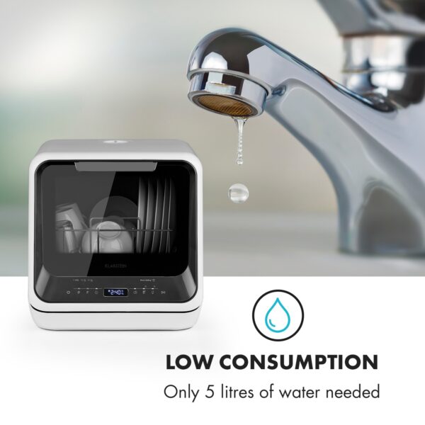 Vyčistiť stôl: umývačka riadu Klarstein Amazonia Mini je malá čistiaca pomôcka do single kuchýň, chát alebo na camping! Špinavý riad od teraz preberá umývačka riadu Klarstein Amazonia Mini. Nájdu si v nej priestor až dve súpravy a v priebehu krátkeho času budú opäť nablýskané čistotou pre ďalšie použitie. Na LED displeji si jednoducho vyberiete zo šiestich programov. Okrem úsporného Eco režimu a hodinového programu máte k dispozícii ešte praktické programy na umývanie ovocia, sterilizáciu dojčenského riadu, umývanie skla alebo aj nápomocný rýchly program. Pomocou funkcie sušenia odstraňuje cirkulácia sviežeho vzduchu zápachy, suší riady a udržuje ich bez zápachov až po dobu 72 hodín. Vďaka jej kompaktným rozmerom si umývačka riadu Klarstein Amazonia Mini nájde priestor na každom mieste. Nie je potrebná žiadna inštalácia, svoju službu môže vykonávať takmer všade: na prevádzku postačí elektrické pripojenie, 5 litrov vody a vedro. Keď už ju viac nepotrebujete, dá sa jednoducho a rýchlo priestorovo úsporne uskladniť. Malý čistiaci zázrak: umývačka riadu Klarstein Amazonia Mini prináša lesk do každej kuchyne a nechá špinavý riad bleskovo opäť zažiariť.