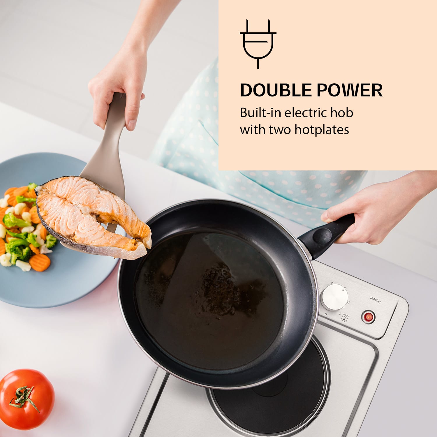 Jednoduchá, výkonná a geniálna: robustná elektrická varná doska Klarstein Appetito Domino presviedča svojim super jednoduchým použitím, klasickým dizajnom a svojim výkonom. Dve nad sebou zoradené varné plochy s výkonom 1 x 1000 a 1 x 2000 wattov, dva otočné ovládače so 6 stupňami výkonu a LED kontrolka: hotová je zabudovaná varná doska, ktorá si nájde miesto v každej kuchyni. Lesklý finiš dotvára povrch z nerezovej oceli, ktorý sa ľahko čistí.