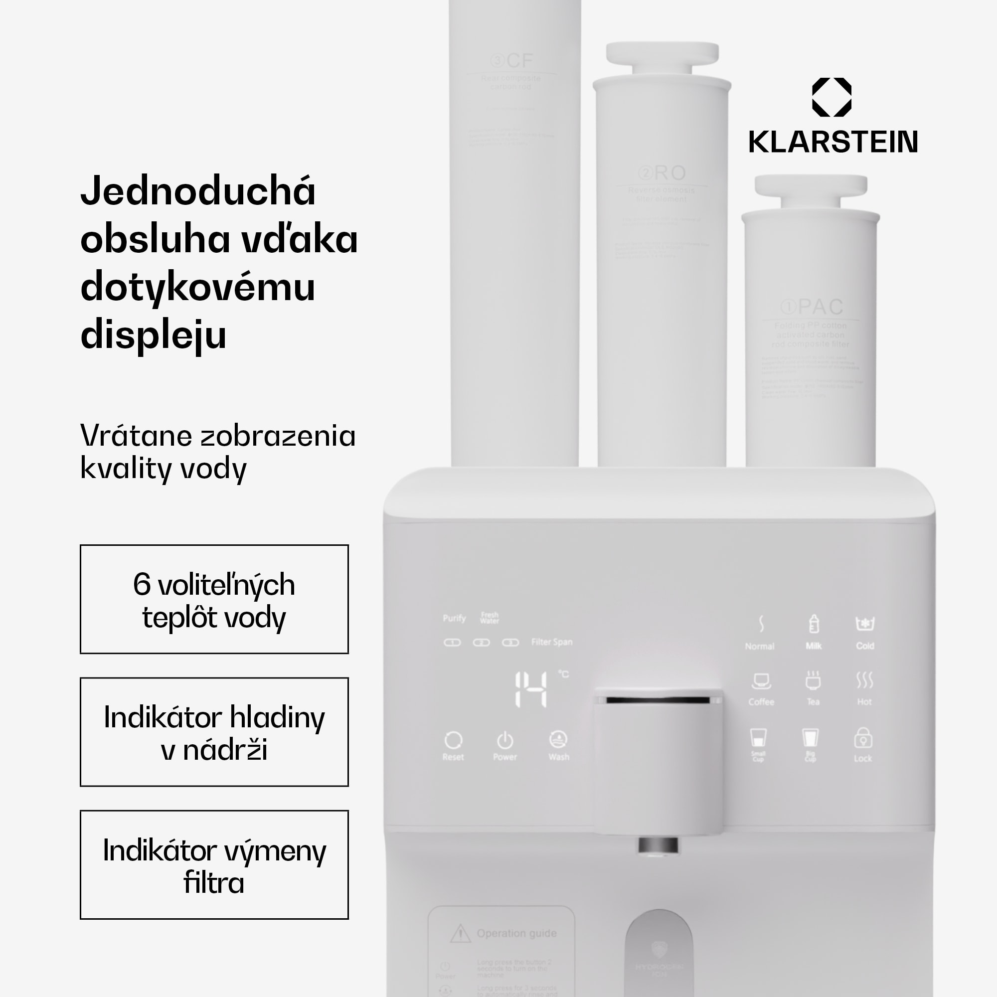 Čistička vody Klarstein AquaFina 6L predstavuje revolúciu v úprave vody vďaka inovatívnemu systému reverznej osmózy a ďalším funkciám. Vďaka trojstupňovému filtračnému systému a piatim stupňom čistenia zaručuje čerstvú a chutnú vodu. Systém pozostáva z predfiltra 2 v 1, membrány na reverznú osmózu a postfiltra 2 v 1.Za osobitnú pozornosť stojí obohacovanie vody plynným vodíkom bez akýchkoľvek škodlivých vedľajších produktov. Extrémne malé molekuly vodíka dokážu eliminovať voľné radikály a zvyšujú antioxidačné vlastnosti vody. Z technického hľadiska čistička vody Klarstein AquaFina 6L zaujme 6-litrovou nádržou, moderným stolovým dizajnom a jednoduchou inštaláciou bez pripojenia na vodu. HD dotykový displej umožňuje výber 6 rôznych teplôt vody a zobrazuje kvalitu vody.O bezpečnosť sa stará detská poistka, ktorá monitoruje spotrebu vody a spustí alarm, keď je nádrž na čerstvú vodu prázdna alebo nádrž na odpadovú vodu plná. Vďaka trom filtrom s dlhou životnosťou (PAC do 12 mesiacov, RO do 24 mesiacov, aktívne uhlie do 12 mesiacov), efektívnemu filtračnému výkonu 30 litrov za hodinu a nízkemu prietokovému pomeru kombinuje čistička vody Klarstein AquaFina 6L inovatívnu technológiu, užívateľskú prívetivosť a účinnosť.Náhradné filtre pre tento výrobok môžete nájsť pod číslom produktu: 10045503, 10045504, 10045505