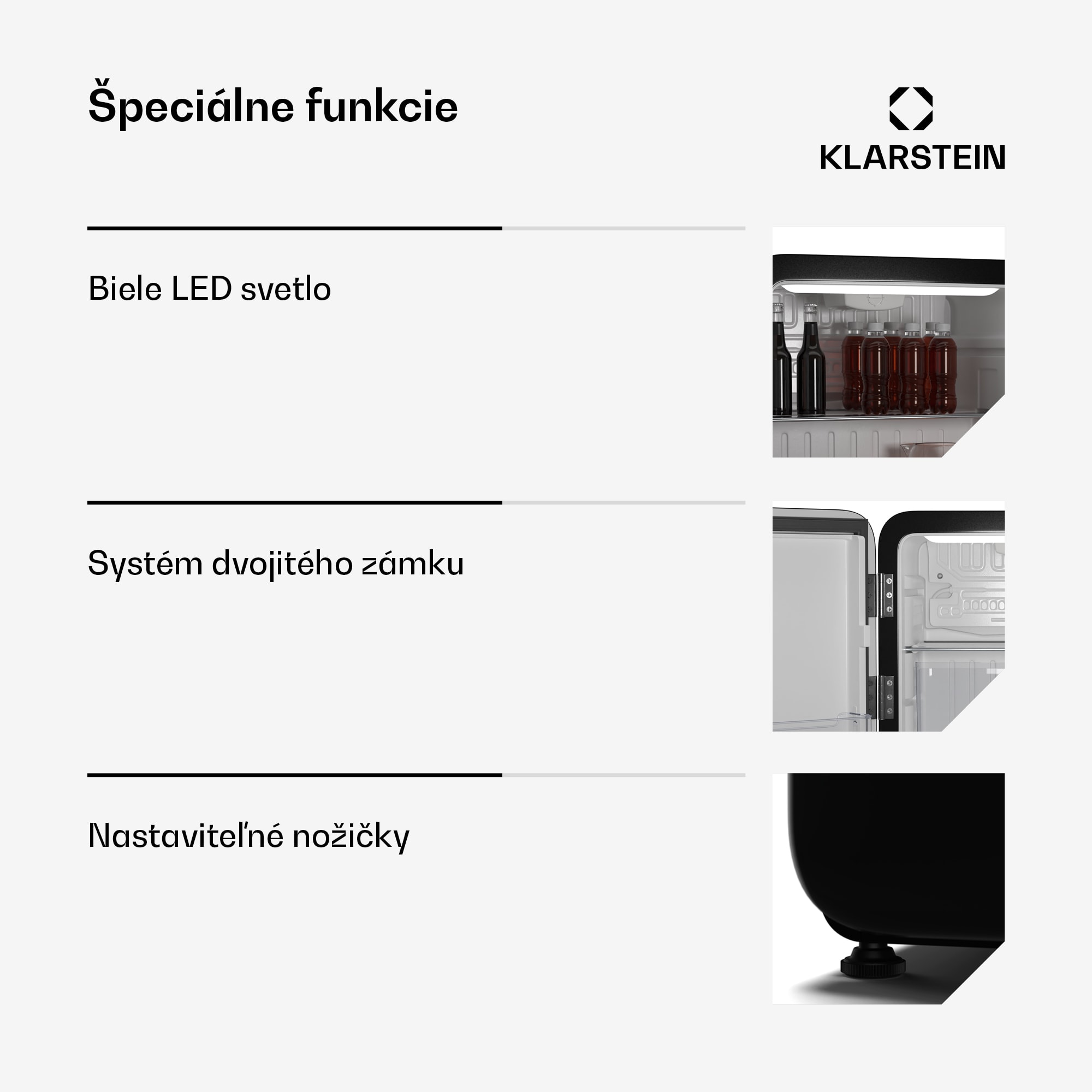 Mini chladnička Klarstein Audrey Evo kombinuje očarujúci retro dizajn s modernou technológiou. S objemom 43 litrov, nízkou hlučnosťou a flexibilnými možnosťami inštalácie je dokonalým doplnkom štýlových obytných a pracovných priestorov.Mini chladnička Audrey Evo od spoločnosti Klarstein ponúka napriek svojej kompaktnej veľkosti dostatok úložného priestoru. Odnímateľná polica a praktická priehradka vo dverách umožňujú prehľadné usporiadanie nápojov a občerstvenia. Vďaka nastaviteľným nožičkám a obojstranným dverám je chladnička mimoriadne prispôsobivá – ideálna do miestností s obmedzeným priestorom, ako sú hotelové izby, kancelárie alebo pivnice na párty.Vintage dizajn vnesie do každého prostredia nádych nostalgie. Chladnička pracuje s výkonným kompresorovým chladiacim systémom a vďaka mechanickému termostatu umožňuje presnú reguláciu teploty od 0 °C do 10 °C. S prevádzkovou hlučnosťou iba 40 dB je dostatočne tichá na to, aby nerušila ani pri odpočinku, ani pri práci.Kúpte si mini chladničku Klarstein Audrey Evo – kompaktná, tichá a štýlová do každého prostredia.