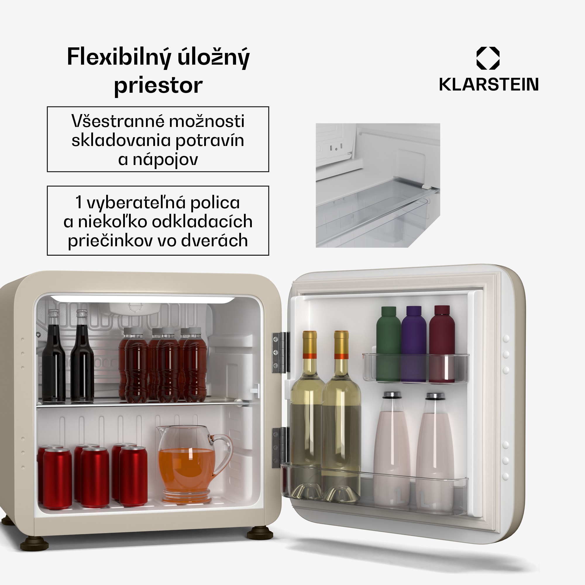 Mini chladnička Klarstein Audrey Evo kombinuje očarujúci retro dizajn s modernou technológiou. S objemom 43 litrov, nízkou hlučnosťou a flexibilnými možnosťami inštalácie je dokonalým doplnkom štýlových obytných a pracovných priestorov.Mini chladnička Audrey Evo od spoločnosti Klarstein ponúka napriek svojej kompaktnej veľkosti dostatok úložného priestoru. Odnímateľná polica a praktická priehradka vo dverách umožňujú prehľadné usporiadanie nápojov a občerstvenia. Vďaka nastaviteľným nožičkám a obojstranným dverám je chladnička mimoriadne prispôsobivá – ideálna do miestností s obmedzeným priestorom, ako sú hotelové izby, kancelárie alebo pivnice na párty.Vintage dizajn vnesie do každého prostredia nádych nostalgie. Chladnička pracuje s výkonným kompresorovým chladiacim systémom a vďaka mechanickému termostatu umožňuje presnú reguláciu teploty od 0 °C do 10 °C. S prevádzkovou hlučnosťou iba 40 dB je dostatočne tichá na to, aby nerušila ani pri odpočinku, ani pri práci.Kúpte si mini chladničku Klarstein Audrey Evo – kompaktná, tichá a štýlová do každého prostredia.
