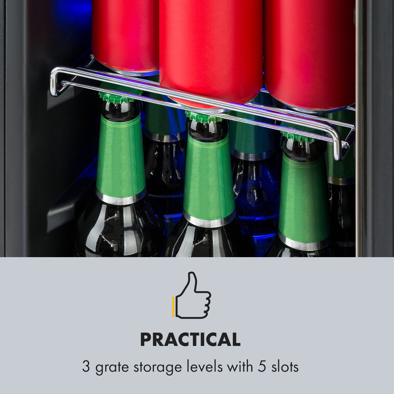 Elegantný dizajn: Klarstein Beerlager 56 chladnička na nápoje vám ponúka ľadové osvieženie kedykoľvek! Okrem moderných sklenených dverí s rámom z nehrdzavejúcej ocele Beerlager 56 zaujme najmä mimoriadne nízkymi teplotami skladovania od 0 do 10 °C! Chladnička s objemom 56 litrov pojme vo svojom vnútornom priestore až 20 fliaš s objemom 0,75 litra. Pivo, víno, džúsy alebo šumivé víno sú uložené na 3 kovových mriežkových policiach a dokonale chladené. Dokonale naaranžovaná a osvetlená: Klarstein Beerlager 56 chladnička na nápoje vám poskytne čisté osvieženie!