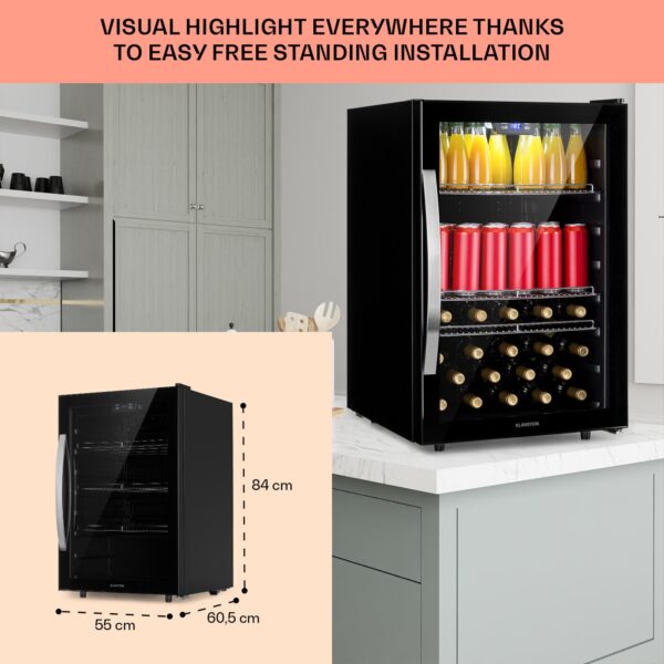 Dobre vychladené osvieženie chutí lepšie: Klarstein Beersafe 5XL je kompaktná chladnička na nápoje s objemom 148 litrov.Tri kovové mriežkové police ponúkajú dostatok priestoru na potraviny a nápoje. Dvojitá izolácia panoramatických sklenených dvierok udržuje chlad bezpečne vo vnútri a teplo vonku. Predná časť z brúsenej nehrdzavejúcej ocele vytvára výrazný kontrast k čiernemu interiéru. Ďalšou zaujímavosťou je vnútorné LED osvetlenie, ktoré dodáva chladničke Beersafe 5XL ten správny šmrnc. Teplotu chladenia možno pohodlne nastaviť pomocou ovládacej plochy s digitálnym displejom. Chladnička Beersafe 5XL od Klarstein vychladí nápoje na osviežujúcu teplotu.