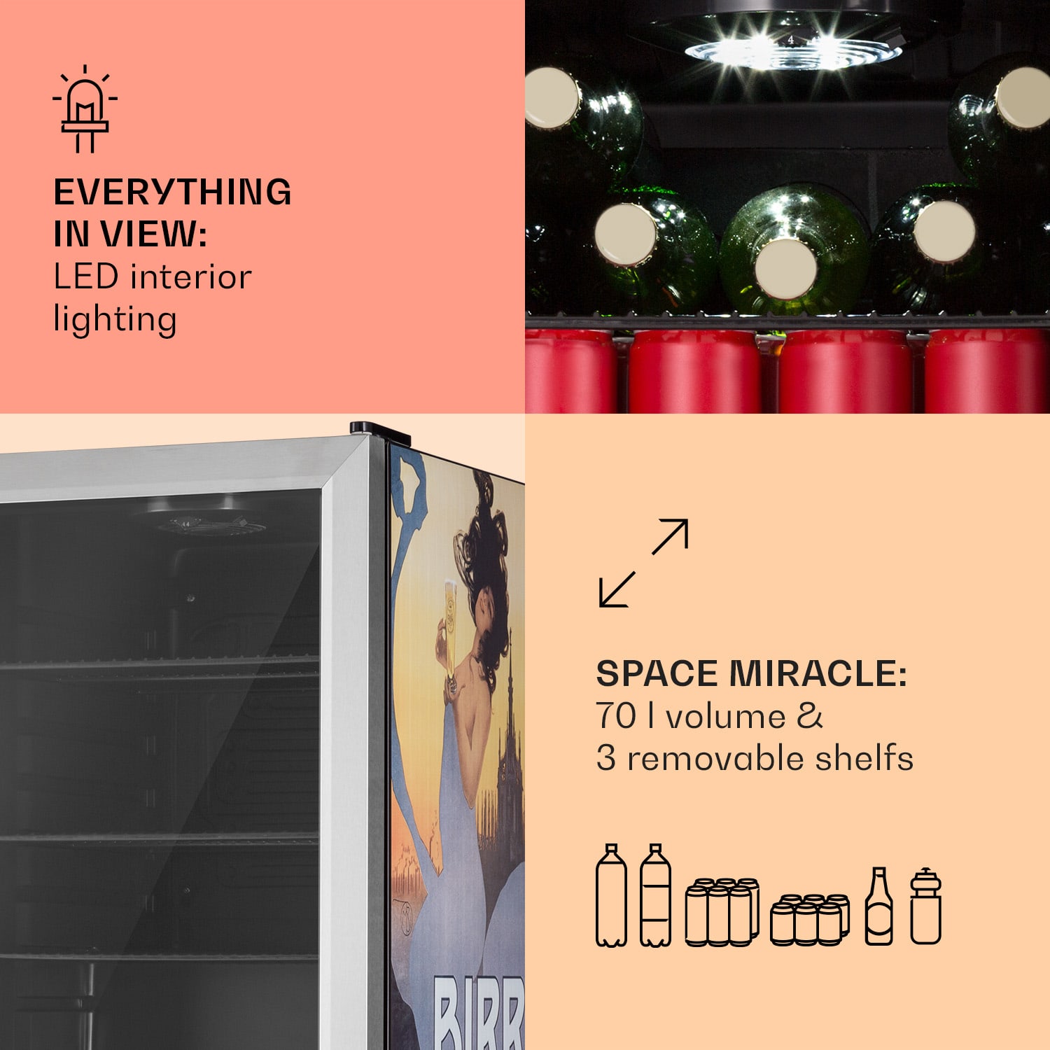 Klarstein Beersafe 70 Birra Milano Edition, chladnička, 70 l, 3 police, panoramatické sklenené dvere, nehrdzavejúca oceľ