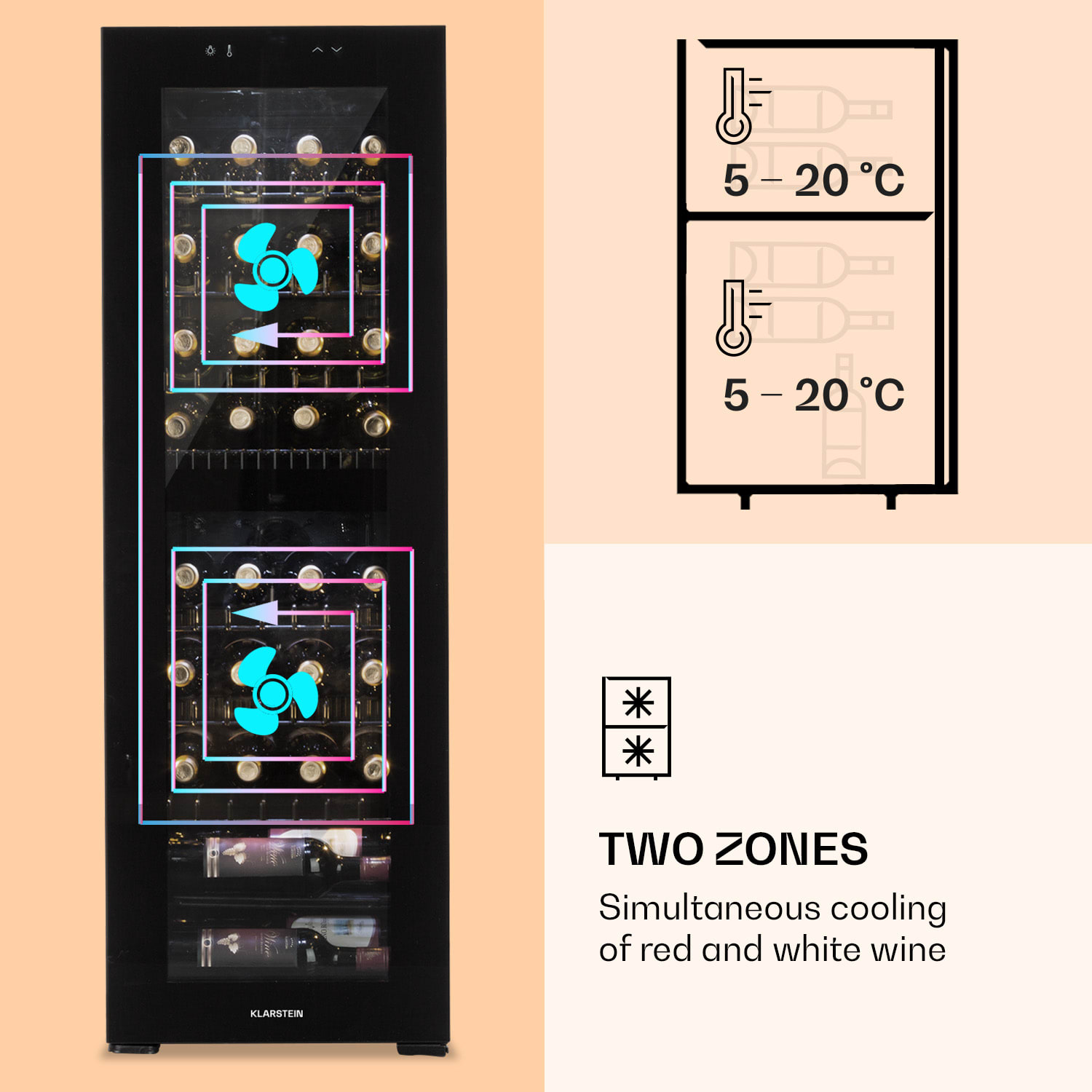 Štýlový pôžitok: v chladiacej vinotéke Klarstein Bellevin deux 39 Flex si nájde miesto až 39 fliaš vína, pričom sú k dispozícii dve chladiace zóny na dosiahnutie dokonalej teploty. Táto dvojzónová vinotéka je ideálna pre milovníkov vína.Pôžitok na plnej čiare. Chladnička ponúka deväť vysúvateľných kovových políc a objem 105 litrov, vďaka čomu uskladní až 39 fliaš vína. Vinotéka je pritom veľmi flexibilná – umožňuje uloženie fliaš naležato, nastojato alebo so sklonom 12°. Dve chladiace zóny zabezpečujú ideálne podmienky na súčasné chladenie rozdielnych druhov vína. Chladiaca teplota ponúka teplotný rozsah od 5 do 20 °C.Chladnička sa ovláda na dotykovej ovládacej sekcii s LCD displejom, ktorý zobrazuje nastavenú teplotu. Popri teplote tu môžete zapnúť/vypnúť vnútorné osvetlenie.Perfektné skladovanie: prednosť vinotéky Klarstein Bellevin deux 39 Flex ponúka nielen perfektné vychladenie a flexibilné skladovanie vína, ale aj príťažlivú prezentáciu vína. Predné dvierka s lesklou čiernou farbou obsahujú panoramatické okno z tvrdeného skla, čo umožňuje obdivovanie vína bez zásahu do chladenia. Decentne elegantné vnútorné osvetlenie pozostáva z dvoch typov LED svetiel: na bočnej strane s teplým bielym svetlom, na hornej strane s chladným bielym svetlom.Elegantný dizajn zapadne do každého štýlu zariadenia, avšak vďaka vysokému prezentačnému faktoru sa mimoriadne hodí na vystavenie na baroch.Vinotéka Klarstein Bellevin deux 39 Flex dokonale vychladí víno a zároveň ho aj perfektne odprezentuje.Prístroj je určený výhradne na skladovanie vína.Tvar fliaš na víno ovplyvňuje maximálny objem a kapacitu vinotéky.