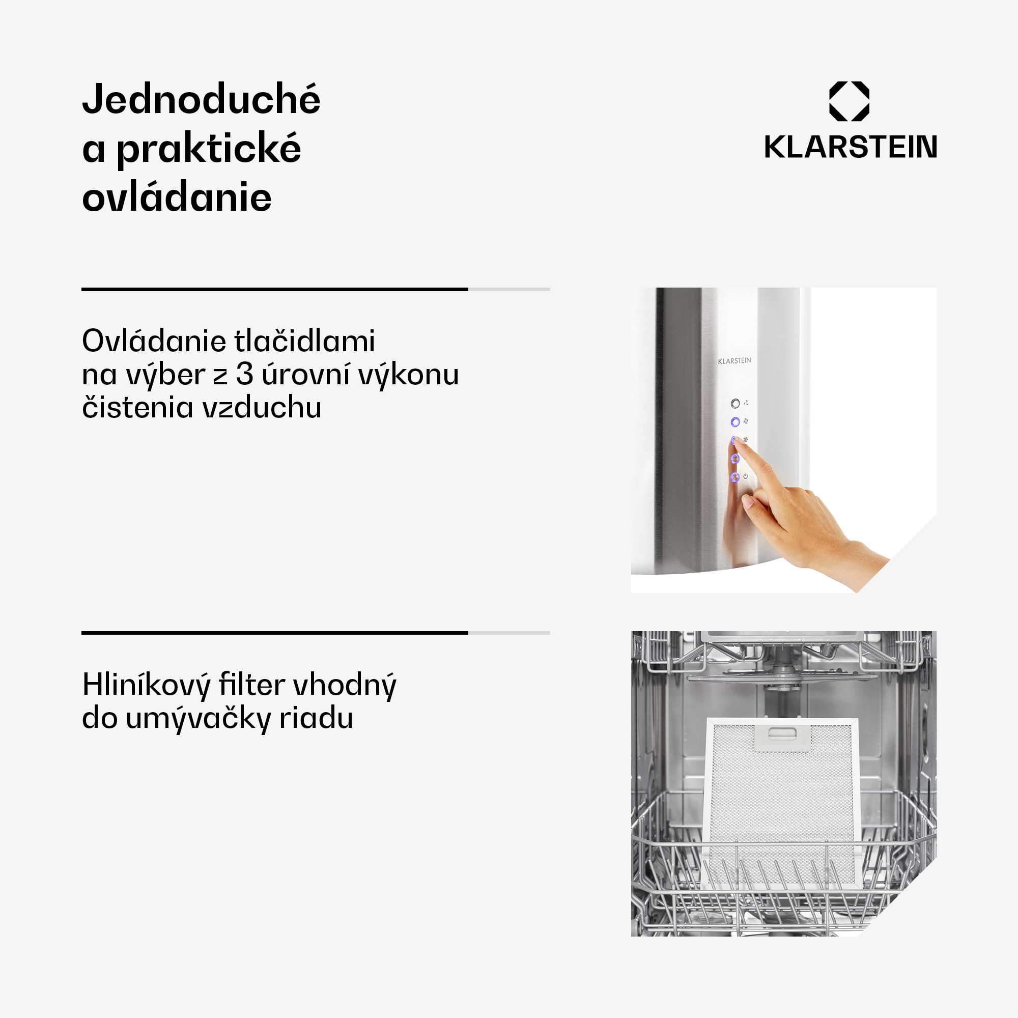 Vystrelte proti výparom a zápachom v kuchyni: ostrovčekový digestor Klarstein Beretta prináša lesk do kuchyne a čistí vzduch od výparov a zápachov.Perfektný pre kuchynské ostrovčeky. S ostrovčekovým digestorom Klarstein Beretta dostanú volne stojace plochy na varenie luxusné zavŕšenie, pretože pri tomto ostrovčekovom digestore je program meno. Odvetrávací stĺp sa upevní bezpečne a stabilne do stropu a postará sa pokojne o vznikajúce výpary v kuchyni. S tromi stupňami odsávania odsaje neúnavne až 650 m³/h vzduchu a očistí vzduch v kuchyni od mastnoty a zápachov. Vďaka tomu je ideálny pre veľké priestory americkej kuchyne s ostrovčekom. Vo všetkých prevádzkových stupňoch poskytuje prepínateľné integrované LED osvetlenie varnej dosky jasné, biele svetlo. Prevádzkové úrovne a osvetlenie sa dajú ľahko zvoliť pomocou predného panela. Ostrovčekový digestor je vhodný pre režim odsávania aj recirkulácie. Aby výfuková trubica nebola viditeľná, disponuje 60 cm dlhým komínovým krytom, ktorý je bezpečne pripojený k nosnej konštrukcii. V recirkulačnom režime dva dodatočné aktívne uhlíkové filtre, zahrnuté v balení (položka 10027530), úplne eliminujú zápach.Absolútne ušľachtilý je aj vonkajší vzhľad ostrovčekového digestora Klarstein Beretta. Zaoblené púzdro z nehrdzavejúcej ocele dodáva Vášmu ostrovu varenia štýlový lesk.Čistý vzduch a ušľachtilý vzhľad: ostrovčekový digestor Klarstein Beretta vytvára v kuchyni skvelé momenty. Ostrovčekový digestor je skutočne nevyhnutným doplnkom pre každú modernú kuchyňu.