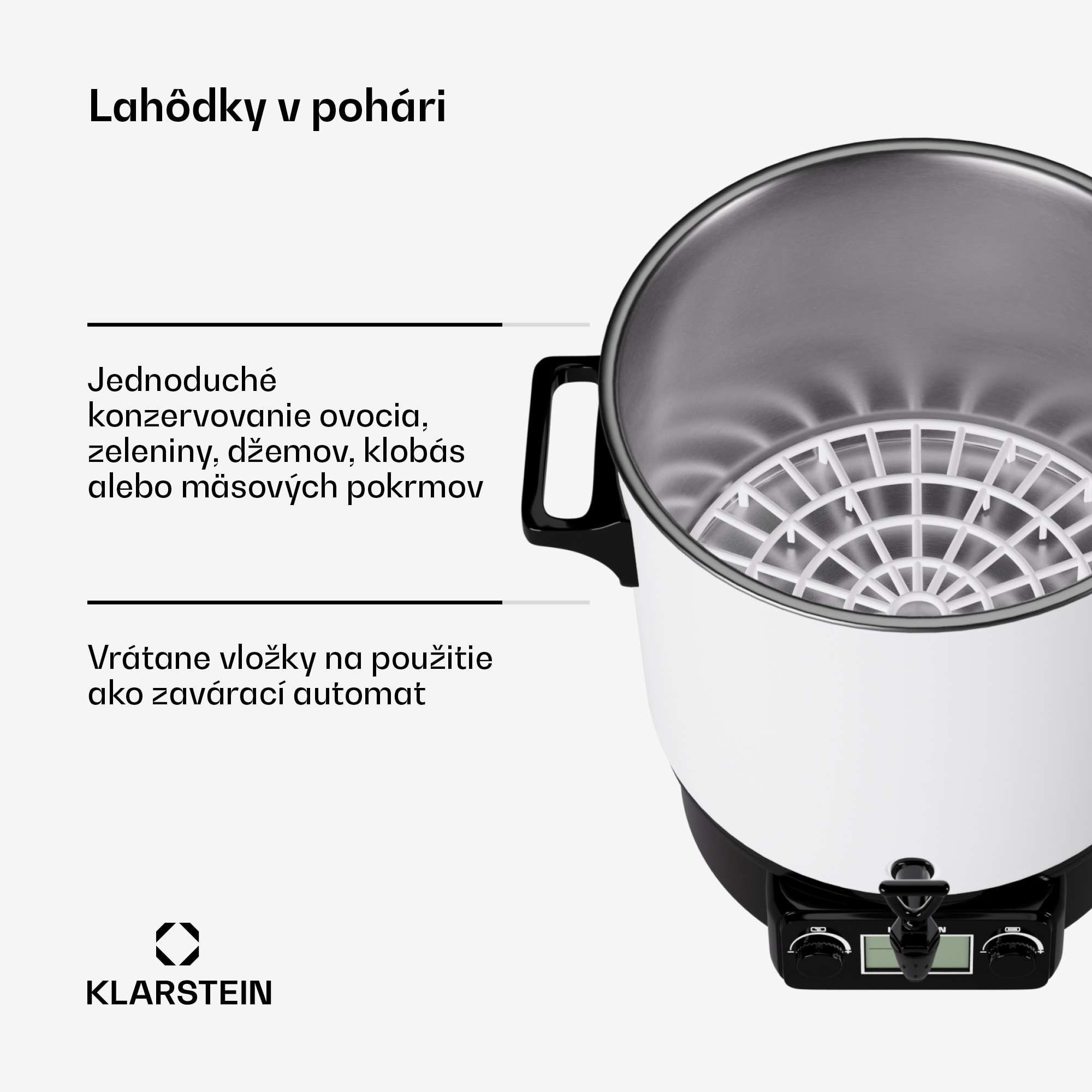 Na zajtrajšok myslíme už dnes: Zima sa blíži! S hrncom na zaváranie Klarstein Biggie Digital si môžete zavariť chutné a zdravé jedlo vo vlastnej kuchyni. Takto budete dokonale pripravení, keď príde zima.Plne automatický hrniec na zaváranie Klarstein Biggie Digital je váš nekomplikovaný kuchynský pomocník, ktorý vám uľahčí prirodzené, chutné a zdravé konzervovanie potravín. Domáce chutí vždy najlepšie – či už ide o ovocie a zeleninu, alebo mäso a klobásy. Do veľkého hrnca z nehrdzavejúcej ocele s objemom 27 litrov sa zmestí naraz až 14 litrových zaváracích pohárov. Teplota a doba varenia sa ľahko volia pomocou dvoch otočných spínačov, potom plne automatický varič s príkonom 1800 W pracuje sám a po uplynutí časovača sa sám vypne. Na prehľadnom digitálnom displeji sa zobrazuje aktuálna teplota v hrnci a zostávajúca doba časovača. Klarstein Biggie Digital možno vďaka praktickému kohútiku použiť aj ako dávkovač horúcich nápojov, na vypúšťanie vody alebo na dávkovanie horúceho vareného vína, čaju alebo džúsu.Jednoduché vytvorenie vlastných zásob. S hrncom na zaváranie Klarstein Biggie Digital máte plnú kontrolu nad svojimi zásobami. Zima tak môže pokojne prísť.Upozorňujeme, že na použitie ako odšťavovač je potrebný ďalší odšťavovací nadstavec, ktorý nie je súčasťou dodávky.