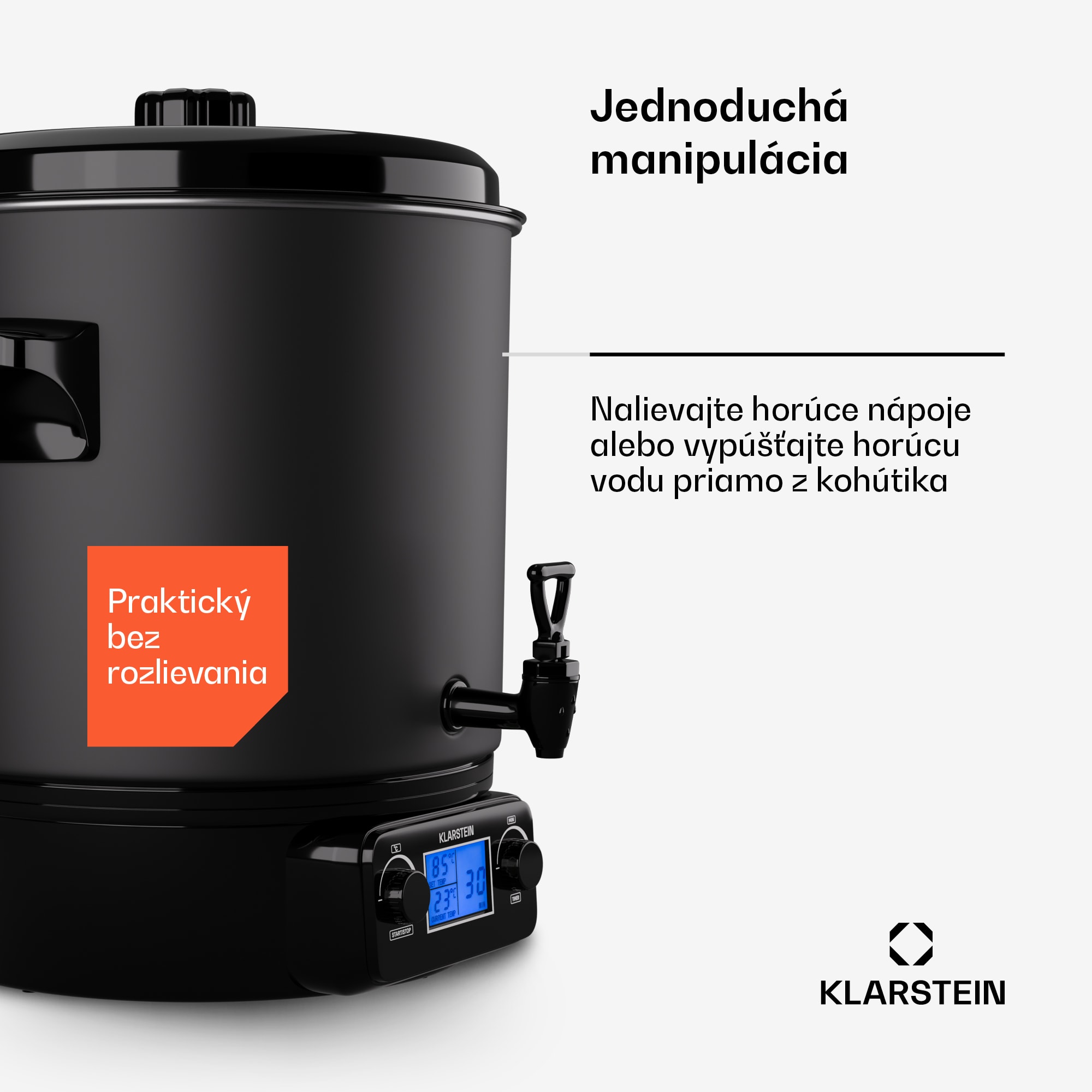 Na zajtrajšok myslíme už dnes: Zima sa blíži! S hrncom na zaváranie Klarstein Biggie Digital si môžete zavariť chutné a zdravé jedlo vo vlastnej kuchyni. Takto budete dokonale pripravení, keď príde zima.Plne automatický hrniec na zaváranie Klarstein Biggie Digital je váš nekomplikovaný kuchynský pomocník, ktorý vám uľahčí prirodzené, chutné a zdravé konzervovanie potravín. Domáce chutí vždy najlepšie – či už ide o ovocie a zeleninu, alebo mäso a klobásy. Do veľkého hrnca z nehrdzavejúcej ocele s objemom 27 litrov sa zmestí naraz až 14 litrových zaváracích pohárov. Teplota a doba varenia sa ľahko volia pomocou dvoch otočných spínačov, potom plne automatický varič s príkonom 2000 W pracuje sám a po uplynutí časovača sa sám vypne. Na prehľadnom digitálnom displeji sa zobrazuje aktuálna teplota v hrnci a zostávajúca doba časovača. Klarstein Biggie Digital možno vďaka praktickému kohútiku použiť aj ako dávkovač horúcich nápojov, na vypúšťanie vody alebo na dávkovanie horúceho vareného vína, čaju alebo džúsu.Jednoduché vytvorenie vlastných zásob. S hrncom na zaváranie Klarstein Biggie Digital máte plnú kontrolu nad svojimi zásobami. Zima tak môže pokojne prísť.Upozorňujeme, že na použitie ako odšťavovač je potrebný ďalší odšťavovací nadstavec, ktorý nie je súčasťou dodávky.