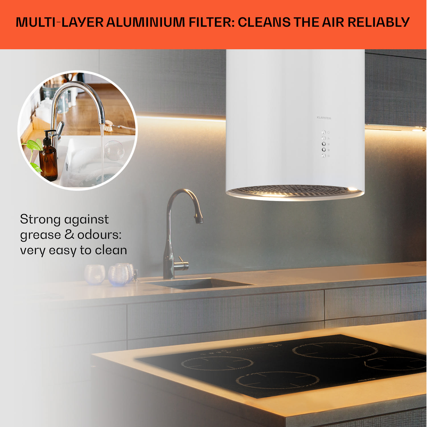 Elegancia pre čistý vzduch: Ostrovčekový digestor Bolea od Klarstein prináša do kuchyne nový lesk a vyčistí pri tom vzduch od zápachov a pary.Dokonalosť pre váš kuchynský ostrovček. S digestorom Bolea od Klarstein získajú voľne stojace varné plochy záverečný luxusný doplnok. Stĺpový digestor je pevne a bezpečne upevnený na strope a spoľahlivo sa postará o vznikajúce výpary v kuchyni. V troch odsávacích stupňoch odstráni až 600 m³/h vzduchu a očistí tak kuchyňu od tukov a zápachov. Týmto je ideálny do väčších priestorov americkej kuchyne s ostrovčekom. Zabudované LED osvetlenie kuchynskej plochy poskytuje vo všetkých výkonnostných stupňoch jasné, teplé svetlo. Výkon a svetlo sa dajú jednoducho zapínať pomocou predného ovládacieho panelu. Ostrovčekový digestor sa dá používať v recirkulačnom režime ale aj s odsávaním vzduchu. Aby odsávaciu hadicu nebolo vidieť, je k dispozícii kryt, ktorý je bezpečne uchytený s nosnou konštrukciou. Na prestavbu na recirkulačný režim sa hodia filtre s aktívnym uhlím, ktoré sú priamo dostupné v balení.Ostrovčekový digestor Bolea od Klarstein zaujme aj svojim vonkajškom. Zaoblené, čierne telo z nehrdzavejúcej ocele dodáva vášmu ostrovčeku štýlový lesk.