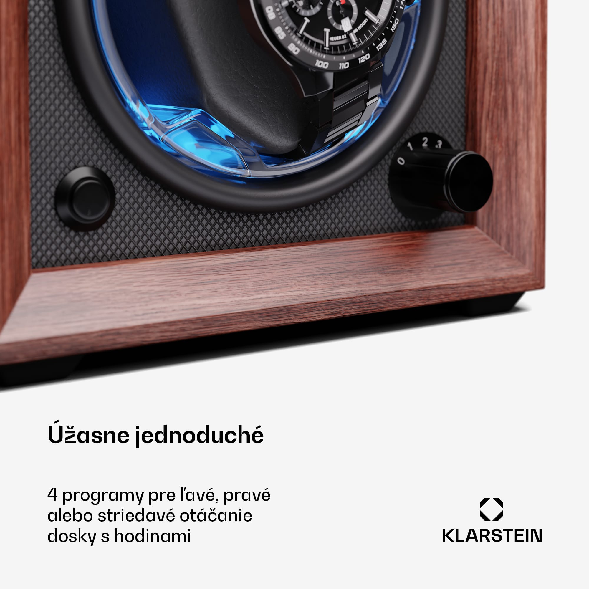 Dokonale tvarované precízne remeselné spracovanie! S naťahovačom hodiniek a stojanom na hodinky Klarstein Brienz 1 budú vaši elegantní spoločníci vždy dobre udržiavaní a pripravení na použitie. Automatické hodinky uložené v zariadení sa nepretržite naťahujú pomocou 4 režimov otáčania, ktoré simulujú pohyb zápästia. K starostlivosti o strojček hodiniek prispieva aj rotácia, ktorá účinne pôsobí proti stuhnutiu olejového mazania. Naťahovač hodiniek Brienz 1 má elegantné puzdro dreveného vzhľadu, ktoré štýlovo zapadne do ambientu každej miestnosti. Štýlové integrované modré osvetlenie LED možno nastaviť pomocou jednoduchého a intuitívneho ovládania. Praktický otočný gombík na nastavenie požadovaného režimu sa nachádza vpravo. Vďaka integrovanému vankúšiku z pamäťovej peny možno do naťahovača ľahko umiestniť hodinky s rôznymi veľkosťami remienkov, ako aj dámske i pánske hodinky. Napájanie sa uskutočňuje prostredníctvom USB kábla, ktorý možno použiť s akýmkoľvek napájacím zdrojom USB, a preto je úplne nezávislý od prevládajúceho typu zásuvky.Vďaka svojim skromným rozmerom a hladkému chodu tichého motorčeka s prevádzkovou hlučnosťou nižšou ako 10 dB možno naťahovač hodiniek jednoducho umiestniť priamo na nočný stolík alebo do iných nehlučných zón.Upozorňujeme, že zobrazené hodinky nie sú súčasťou dodávky.