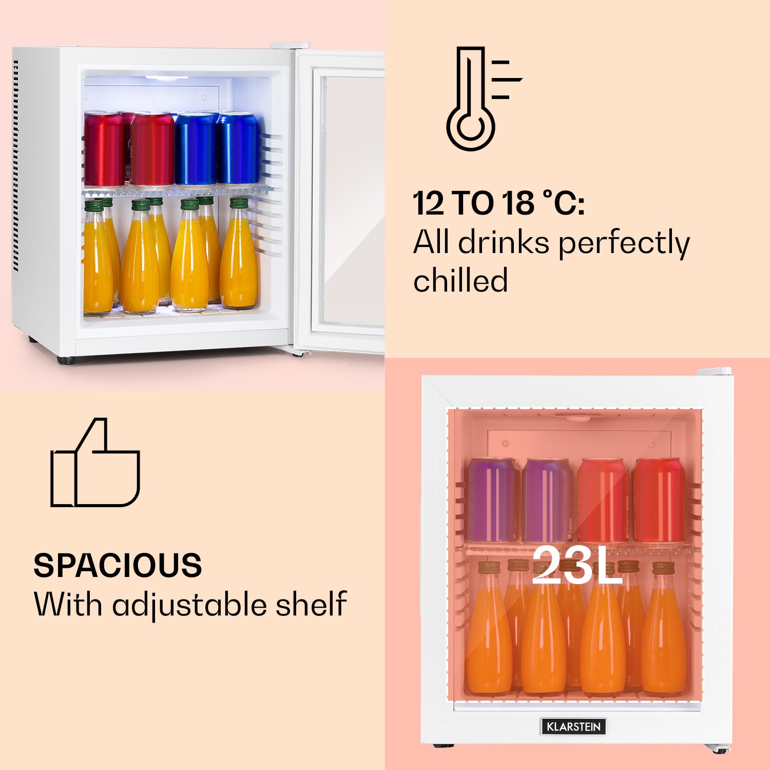 Kompaktná s veľkou úložnou kapacitou: mini-chladnička Klarstein Brooklyn 24 ponúka dostatok priestoru s 24 litrami úžitkového objemu. Možnosť flexibilného usporiadania interiéru vďaka plastovej polici, ktorú možno umiestniť na desiatich úrovniach s rozostupom 2 cm. Na reguláciu chladenia podľa potreby sú k dispozícii 3 stupne od 12 do 18 °C. Prínos pre každú malú domácnosť: mini-chladnička Klarstein Brooklyn 24.