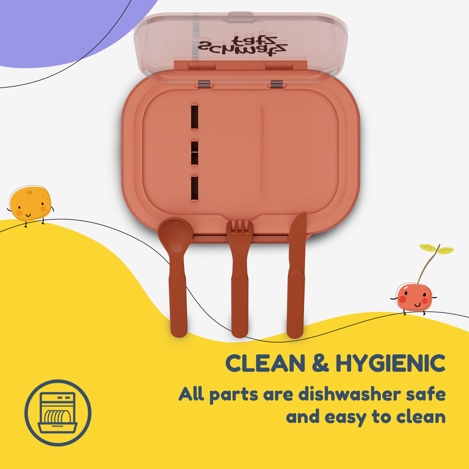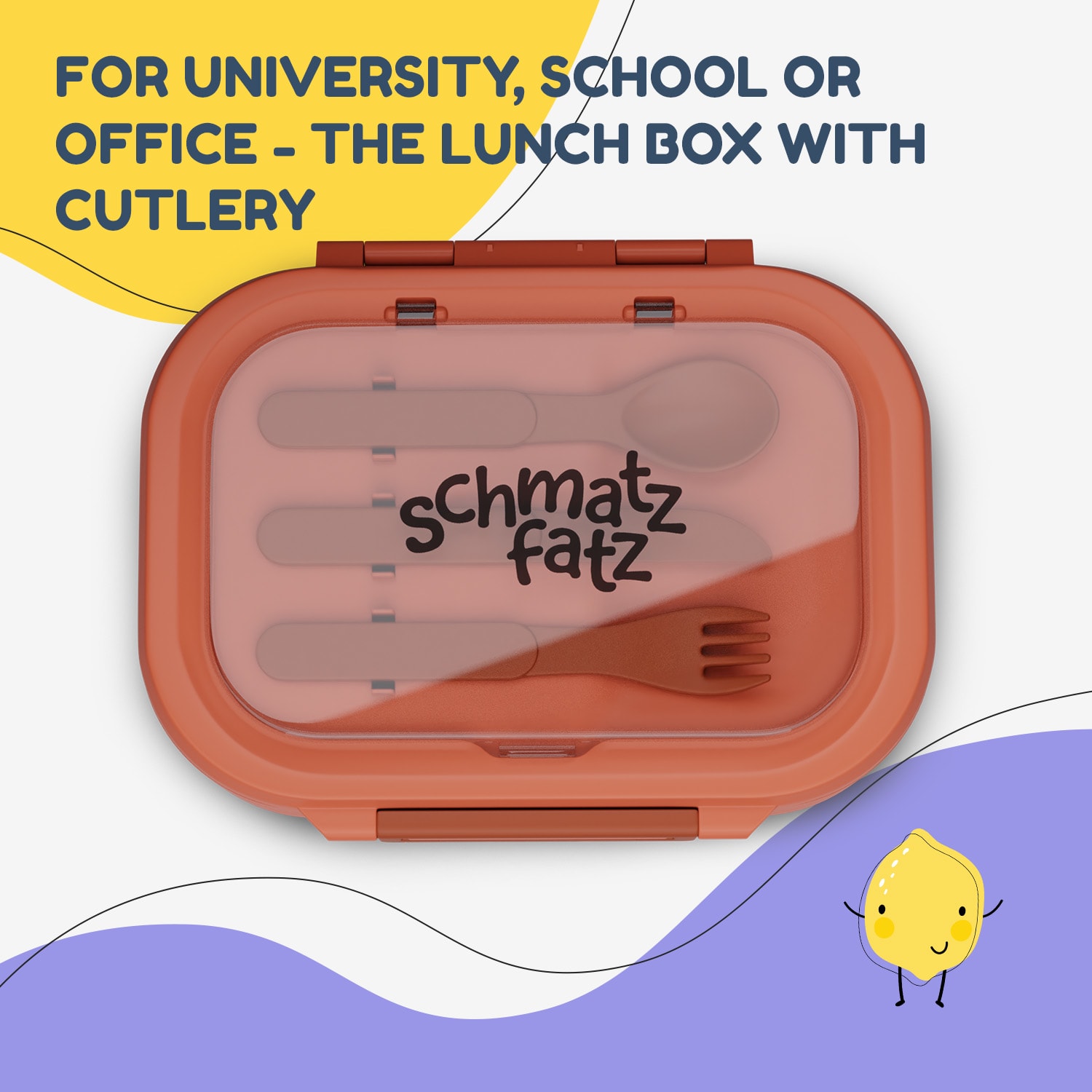 Či už sa chystáte do práce, školy alebo na výlet, desiatový box Schmatzfatz Bunko sa postará o to, aby vaše jedlo zostalo čerstvé, chutné a starostlivo usporiadané počas celého dňa.Disponuje tromi praktickými priehradkami, vďaka ktorým si môžete jedlo prehľadne rozdeliť bez toho, aby sa chute alebo arómy premiešali. Navyše vo veku nájdete malú priehradku s príborom – lyžicou, vidličkou a nožom, takže budete mať všetko potrebné vždy po ruke.Box je vyrobený z odolného Tritanu bez BPA, ktorý je bezpečný pre vaše zdravie a zaručí vám dlhoročné používanie bez poškodenia. Po každom použití ho jednoducho vložíte do umývačky riadu a je pripravený na ďalší deň.