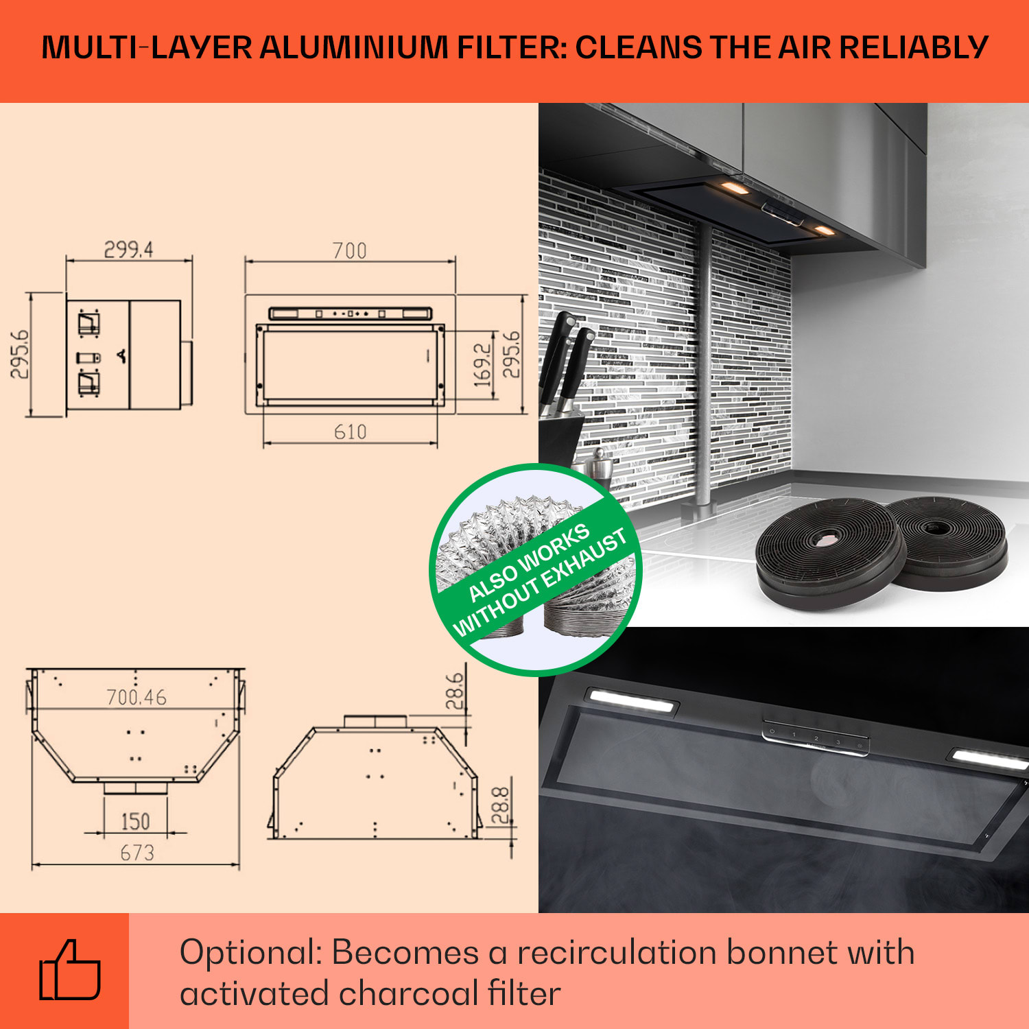 Klarstein Camila, vstavaný digestor, 70 cm, 397 m³/h, LED, dotyková plocha, nehrdzavejúca oceľ