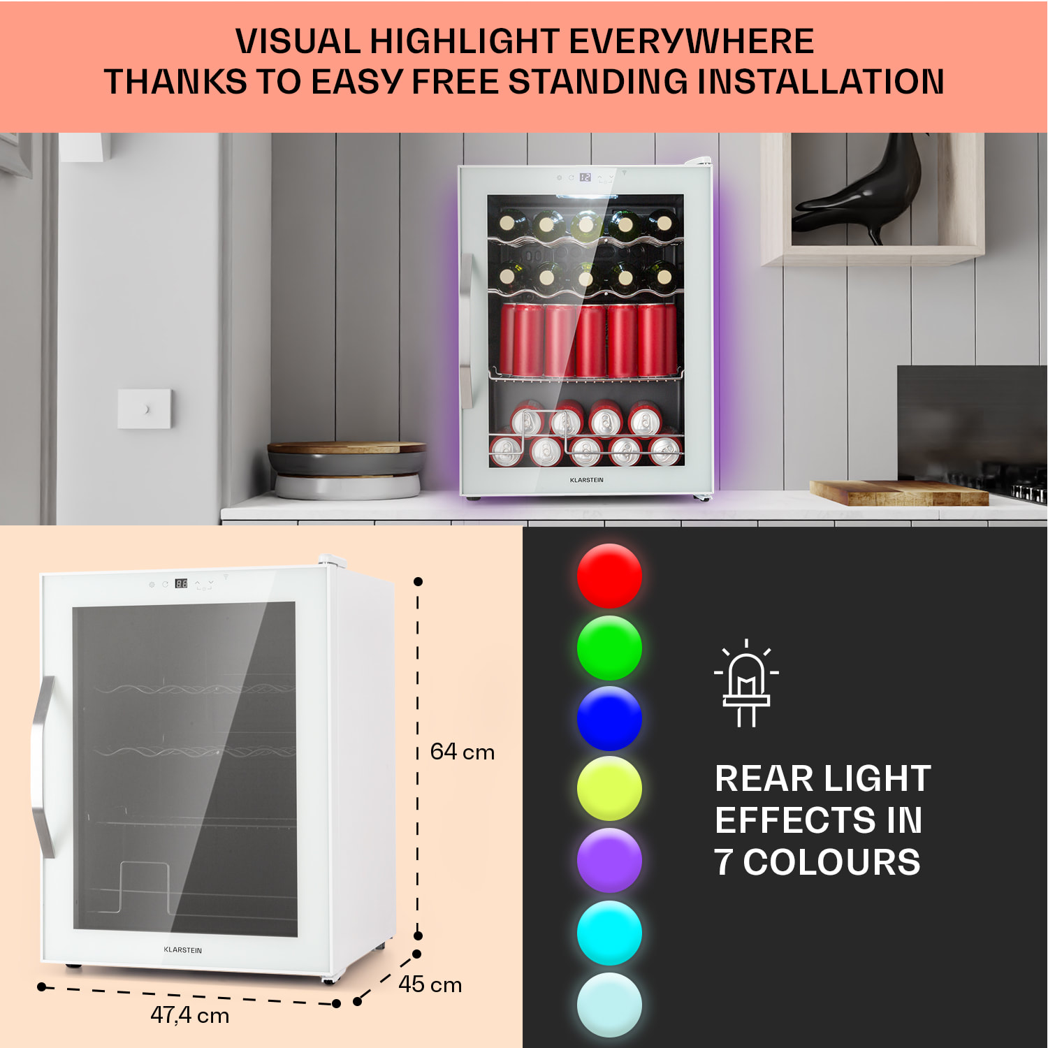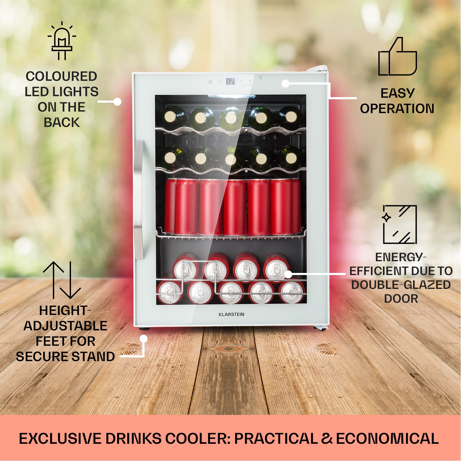 Najlepšie osvieženie za každých okolností: kompaktná chladnička na nápoje Coachella 60 od Klarstein s objemom 60 litrov. Vďaka integrovanej funkcii WiFi môžete teplotu, v rozsahu 3-18 °C, kedykoľvek pohodlne regulovať na diaľku pomocou aplikácie Klarstein. Inteligentná chladnička má vďaka Balanced Light Concept aj podsvietenie, ktoré vytvára príjemnú atmosféru a ktoré rozžiari jej okolie až v 7 rôznych odtieňoch. Tri kovové police poskytujú dostatok priestoru na potraviny a nápoje, zatiaľ čo vnútorné LED osvetlenie poskytuje ten najlepší prehľad. Dotykový ovládací panel umožňuje pohodlné a prehľadné ovládanie priamo na zariadení.Chladnička Coachella 60 od Klarsteinzaujme inteligentnými funkciami a spoľahlivo udrží vaše nápoje pri osviežujúcej teplote.
