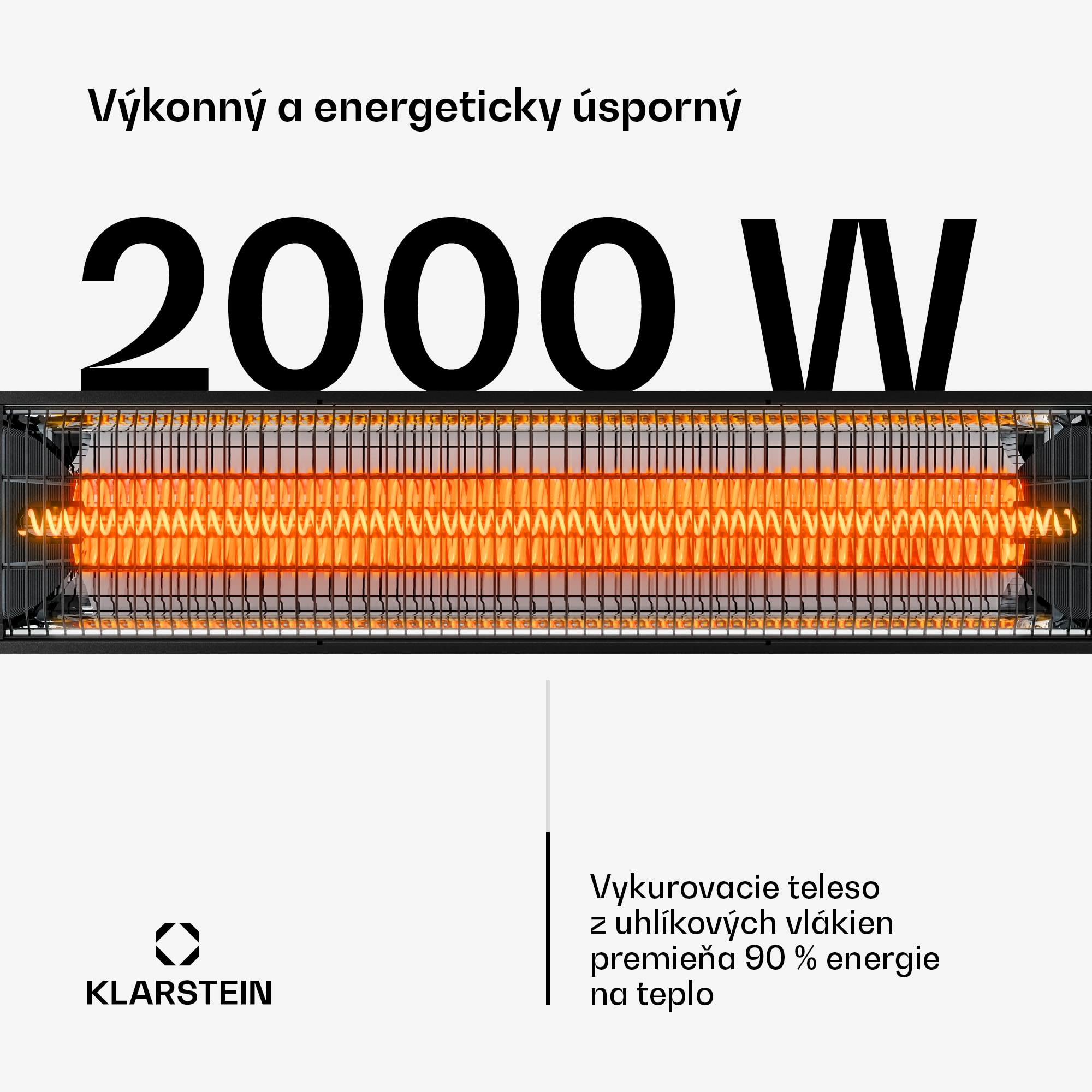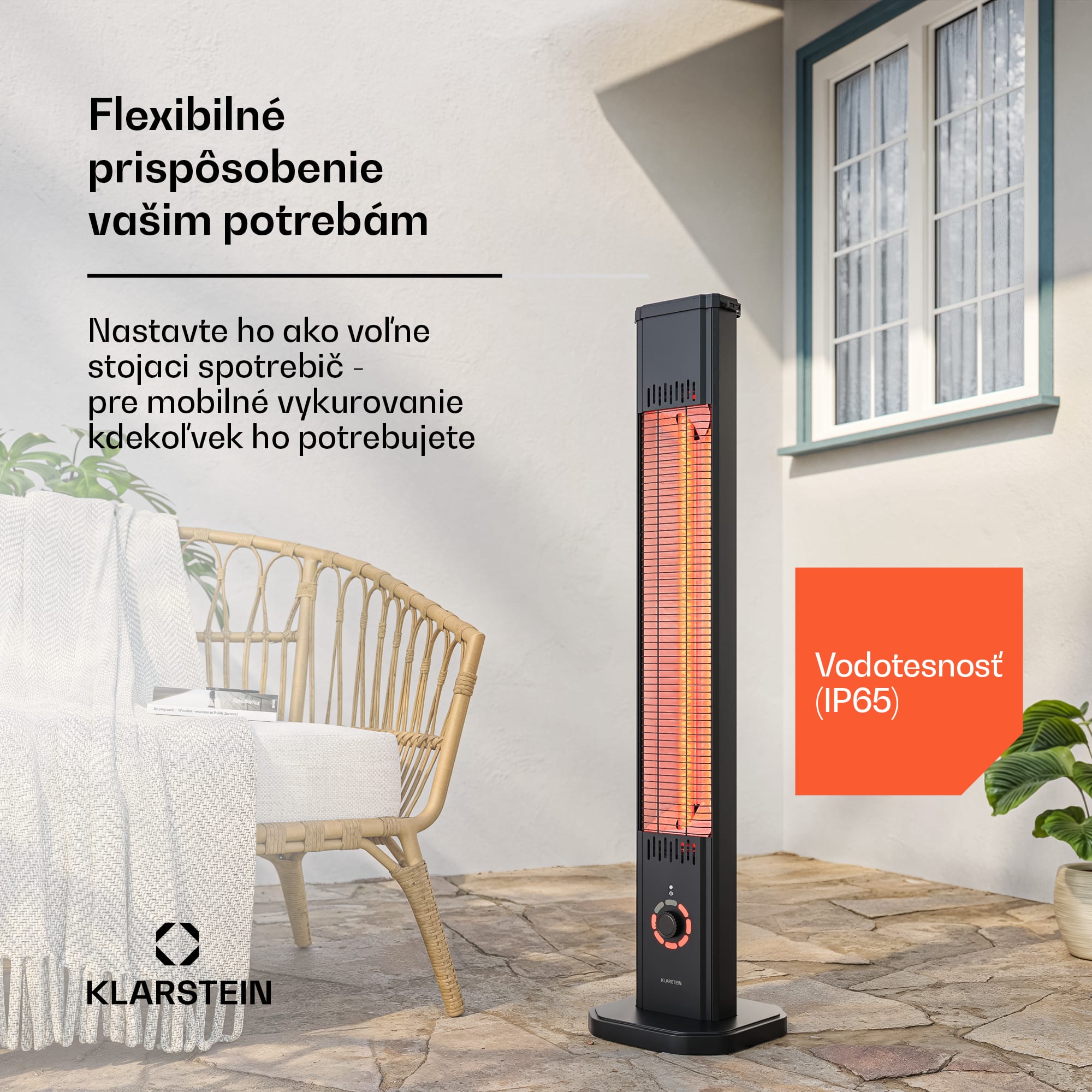 Infračervený ohrievač Klarstein DualisHeat kombinuje vysoký výkon s pohodlnou obsluhou a účinnosťou.Vyhrieva vonkajšie plochy s rozlohou až 15 m² štvorcových s výkonom 2000 W rozdeleného na osem úrovní. Infračervený ohrievač zároveň pracuje efektívne a ticho. Možno ho ovládať diaľkovým ovládačom alebo stlačením tlačidla priamo na spotrebiči.Môže byť umiestnený samostatne alebo na stene. To znamená, že voľne stojace zariadenie na infračervené vykurovanie možno inštalovať individuálne a podľa potreby.Vďaka ochrane proti náklonu stojí spotrebič vždy bezpečne. Časovač zaručuje optimálnu účinnosť a mimoriadne pohodlné používanie.