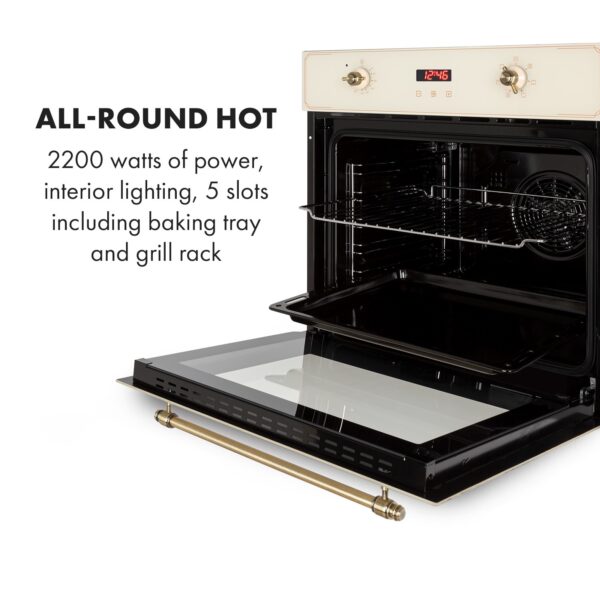 Čas na luxus: vstavaná rúra Klarstein Elizabeth vizuálne kombinuje šarm 19. storočia s modernou technikou 21. storočia a Vašu kuchyňu spraví očarujúcou.S rúrou Klarstein Elizabeth vnesiete do svojej kuchyne čistý retro dizajn. Otočné regulátory v mosadznom dizajne, rovnaká rukoväť na dvierkach a zaoblené okienko rúry oživujú čaro minulosti. Zariadenie má okrem toho najnovšie funkcie: s 2200 W a s triedou energetickej účinnosti A pripravuje šikovne a ekonomicky koláče, nákypy alebo pizzu vo svojom veľkom priestore s kapacitou 70 litrov. Vo vnútri sa dá zapnúť cirkulujúci vzduch, horný a spodný ohrev, ako aj funkcia grilu v 6 kombináciách. Zariadenie splní všetky požiadavky na nekomplikovaný a efektívny kuchynský sporák. Vstavaná rúra Elizabeth okrem toho ponúka ľahko ovládateľný časovač varenia až do 10 hodín, voliteľné teploty od 50 do 250 °C a integrovaný digitálny displej, ktorý zobrazuje všetky nastavenia.So svojím klasicko-krásnym dizajnom a mosadzne sfarbenými prvkami prináša elektrická rúra Elizabeth od spoločnosti Klarstein elegantné akcenty v retro štýle a upúta pohľad v každej kuchyni.